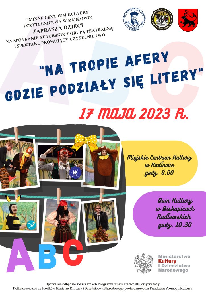 Gminne Centrum Kultury i Czytelnictwa w Radłowie zaprasza dzieci na Spotkanie autorskie z grupą teatralną i Spektakl promujący czytelnictwo pt. „Na tropie afery gdzie podziały się litery” w wykonaniu aktorów Teatru Edukacji i Profilaktyki „Maska” z Krakowa.