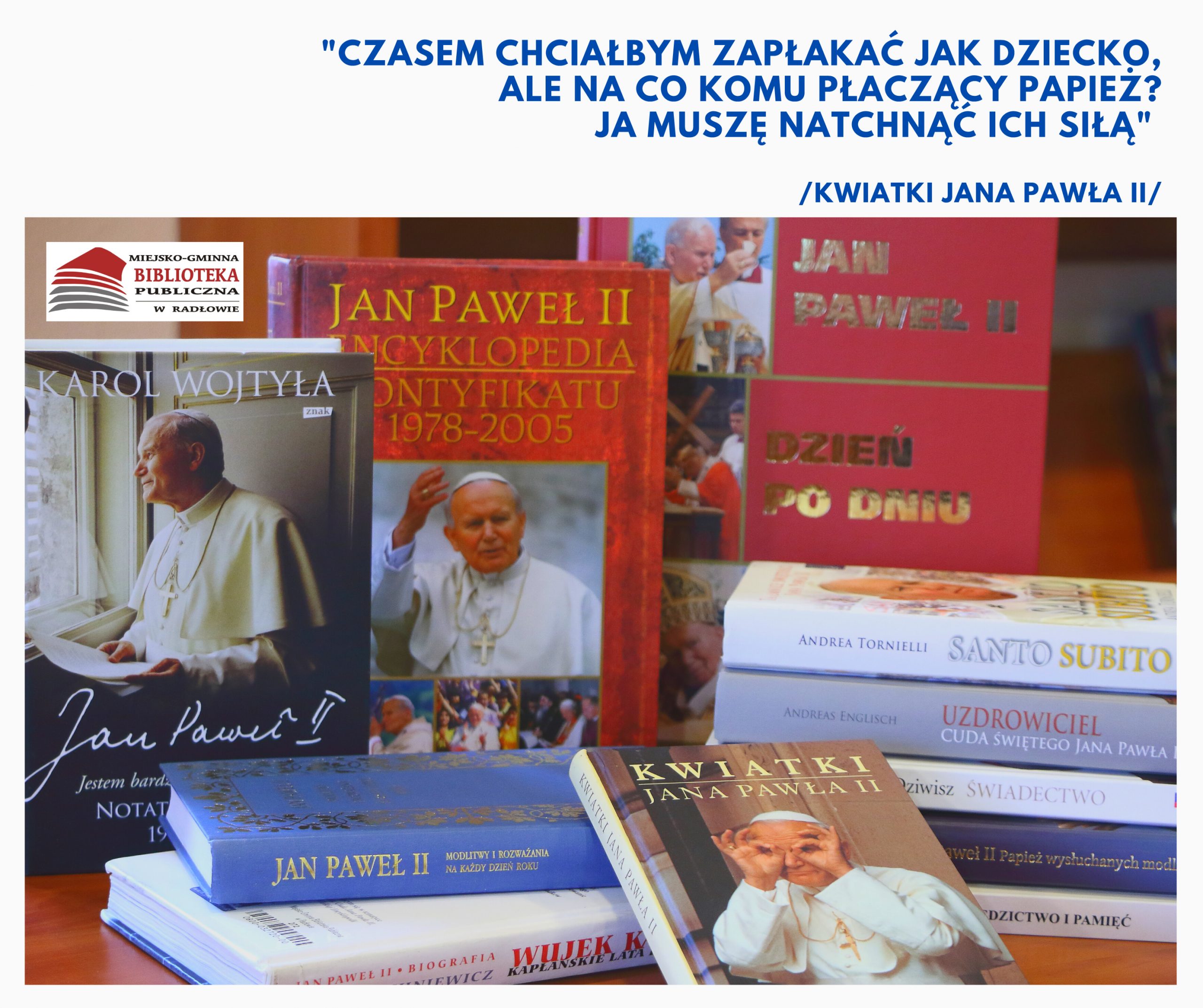 Jan Paweł II był człowiekiem, który wywarł wpływ na historię Kościoła, Polski i całego świata. Jednocześnie pozostał człowiekiem głębokiej refleksji i cichej modlitwy. Pisał poważne traktaty filozoficzne, a jednocześnie słynął z poczucia humoru. O Janie Pawle II napisano wiele książek. Z okazji 100. rocznicy urodzin papieża Polaka prezentujemy wybór pozycji, które mogą zainteresować każdego. To tylko niektóre z naszych propozycji, biblioteka w swoich zbiorach posiada bogaty zasób literatury poświęconej świętemu Janowi Pawłowi II. Serdecznie polecamy i zapraszamy.