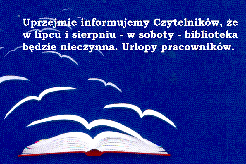 Aktualności 8 lipca 2016 Zbigniew Marcinkowski Godziny otwarcia biblioteki w miesiącu lipcu i sierpniu.