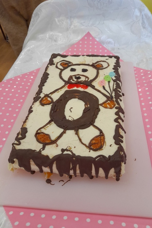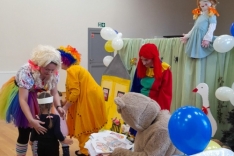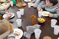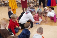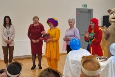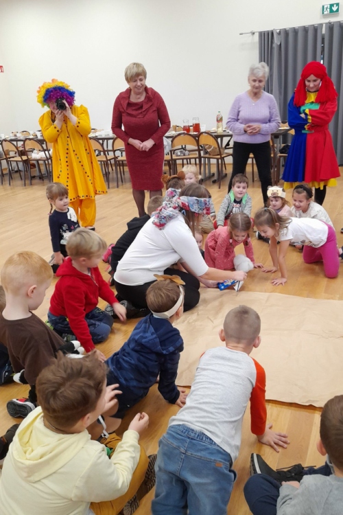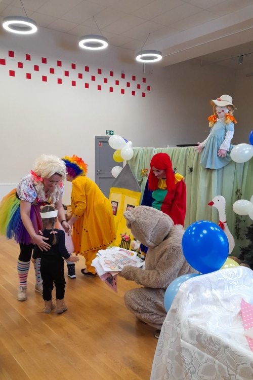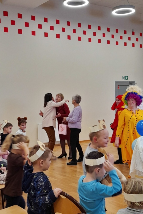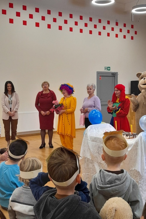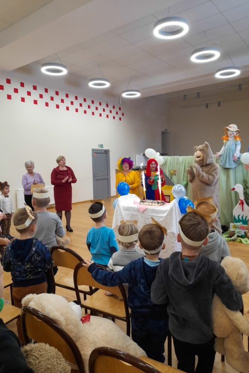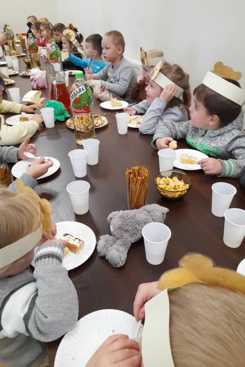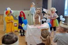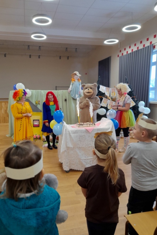 Później rodzice, w bajkowych przebraniach, zaprosiły na salę Misia, głównego bohatera spotkania. Jak na prawdziwych urodzinach, były prezenty dla Misia oraz pyszny, owocowy tort przygotowany przez panie z Koła Gospodyń Wiejskich. Na zakończenie spotkania dzieci zaproszono do tańca i różnych zabaw.