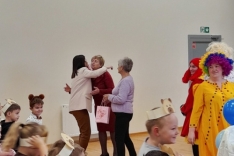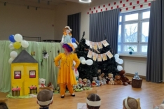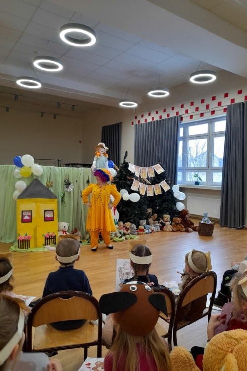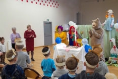 Na powitanie bibliotekarka przeczytała opowiadanie o misiu pluszowym, następnie seniorki z „Teatrzyku Gąska” zaprezentowały przedstawienie kukiełkowe pt.: „Serduszko małego misia”.