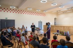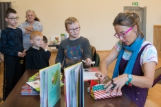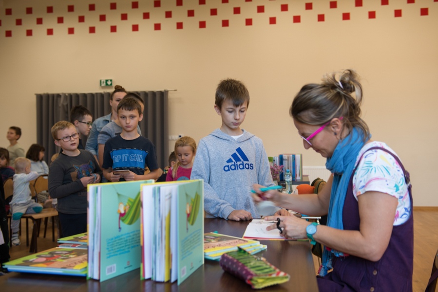 Na zakończenie spotkania E. Piotrowska odpowiadała na pytania dzieci (wiele z nich było zaskakujących), a później podpisywała książki, pieczętując je zabawną pisarską pieczęcią.