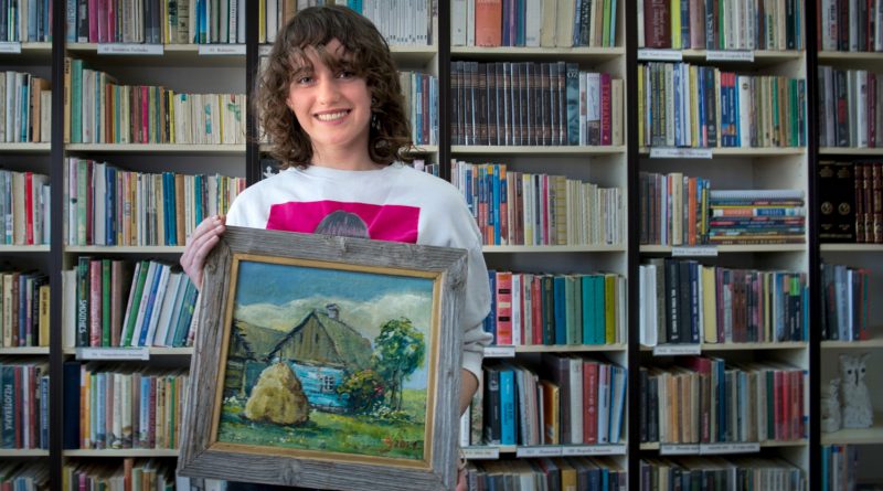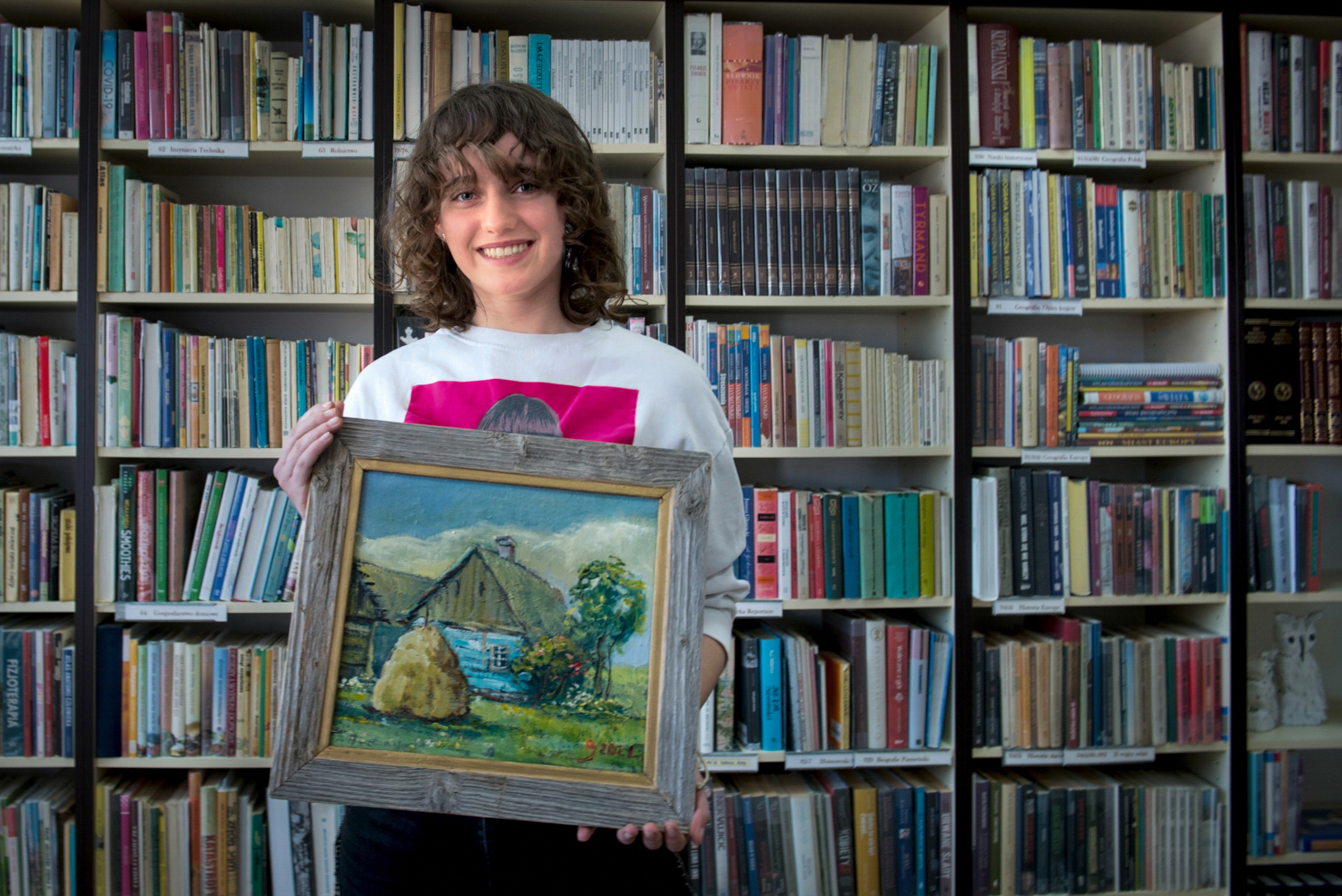 Emilia Mysiak – uczennica Niepublicznej Szkoły w Przybysławicach prezentuje obraz Adama Jańca „Niebieski domek”. Emilia jest osobą uwrażliwioną na sztukę, jej pasją jest fotografia. W przyszłości wiąże z tą dziedziną sztuki szersze zainteresowania.