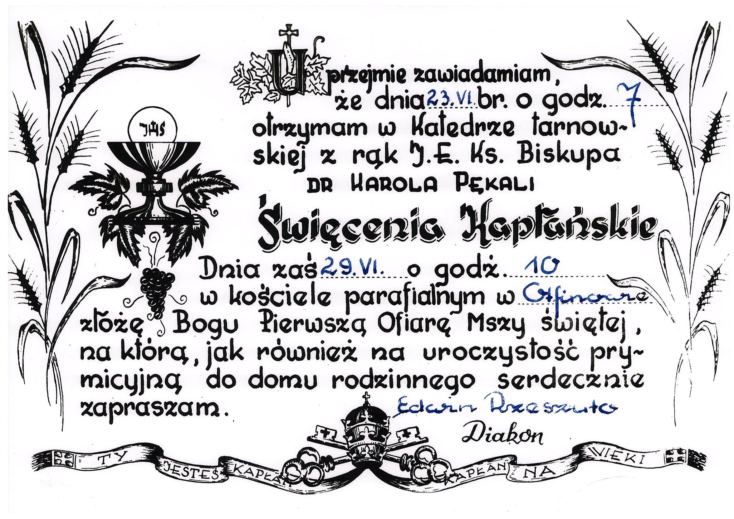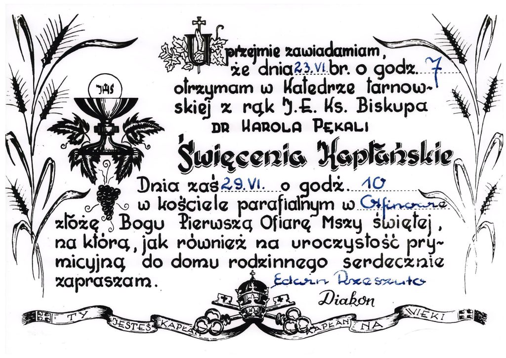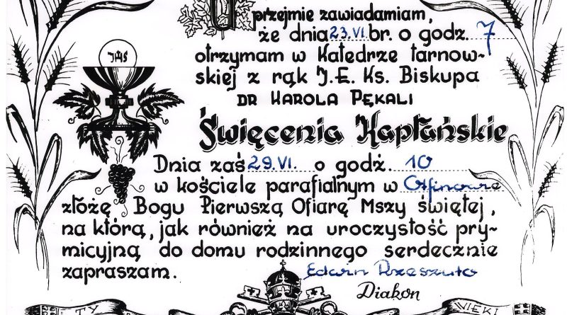 65 lat temu, pochodzący z Przybysławic, ks. prałat mgr lic. Edwin Rzeszuto, przyjął święcenia kapłańskie z rąk biskupa Karola Pękali. Pamiątką tego wydarzenia jest zaproszenie, które udostępniła nam z rodzinnego archiwum pani Dorota Pochroń. Bardzo dziękujemy.