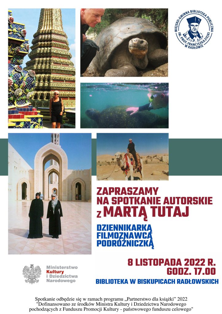 Biblioteka w Biskupicach Radłowskich serdecznie zaprasza wszystkich mieszkańców na spotkanie autorskie z dziennikarką i podróżniczką Martą Tutaj.