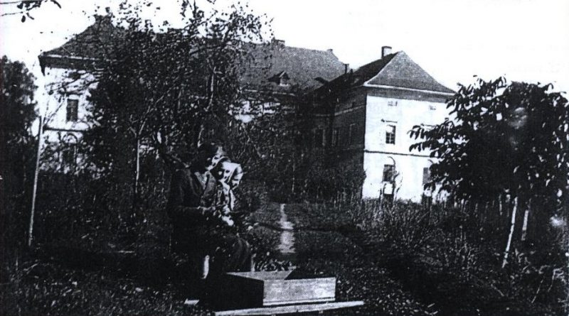 Wydeptana ścieżka wiodąca od pałacu do warzywnego ogrodu i sadu świadczy o tym, że w początkach niemieckiej okupacji w dobrach państwa Dolańskich tętniło życie. Nic jeszcze nie zapowiadało czającej się katastrofy. Na zdjęciu autor wspomnień w swojej pierwszej pracy w pałacowym ogrodzie w otoczeniu pracownic. Wypielęgnowane grządki i młode zadbane drzewka w sadzie świadczą o trwałości przedwojennego majątku, widać dobrze zarządzanego przez dworskiego dyrektora lub ekonoma.