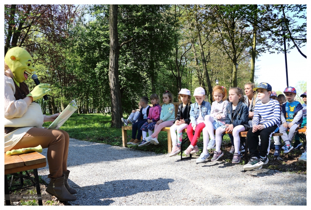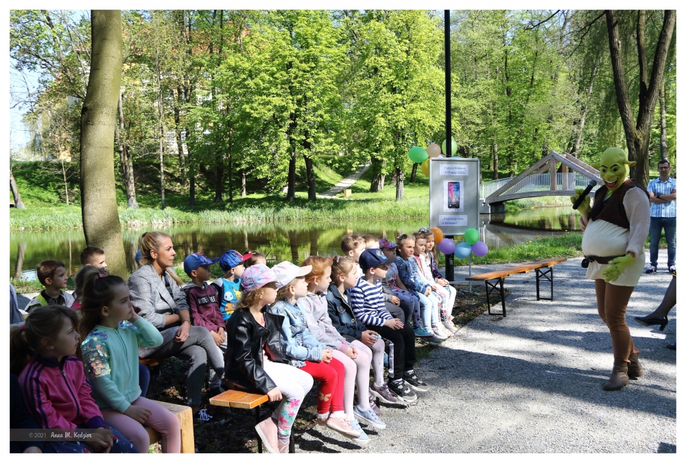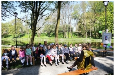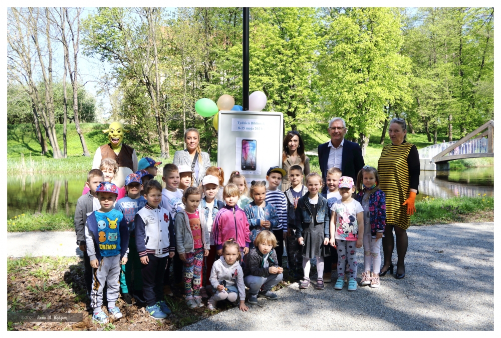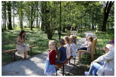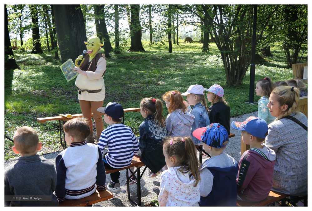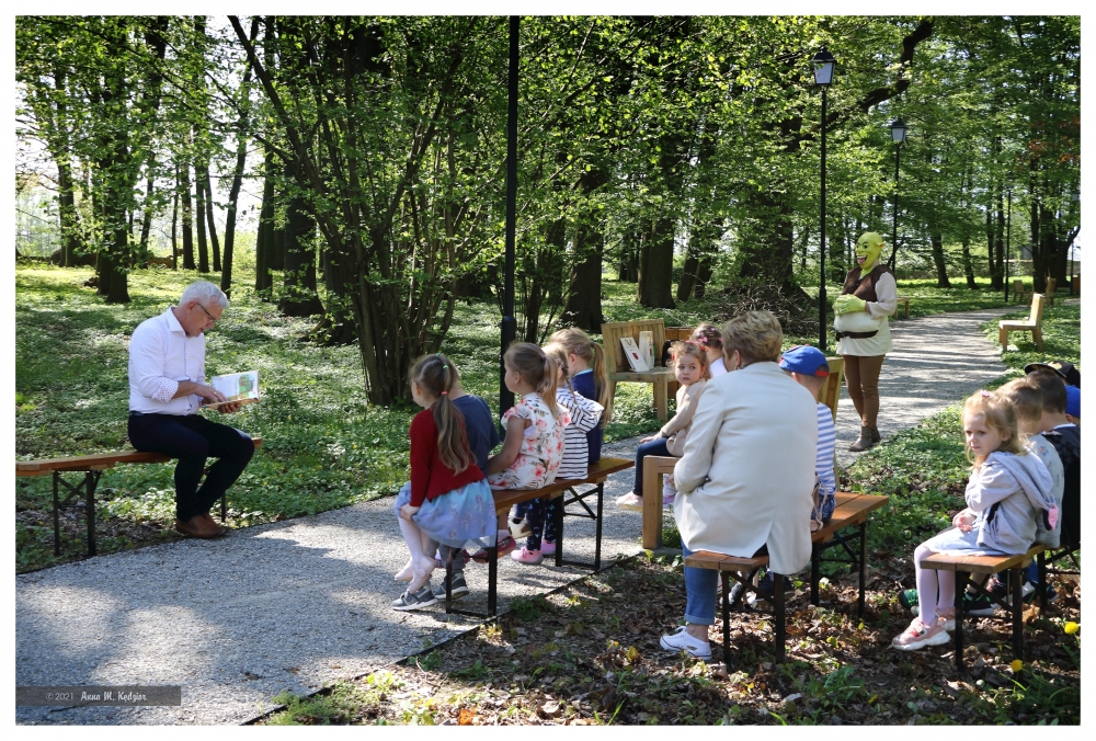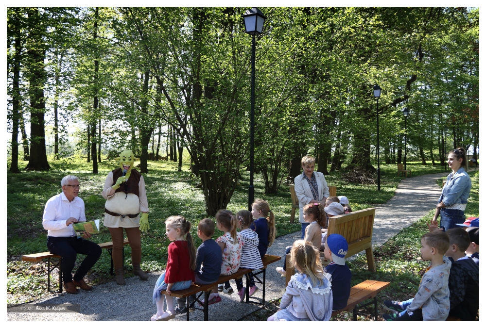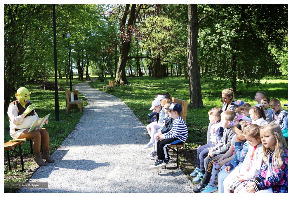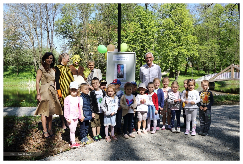 W przepięknej majowej scenerii radłowskiego parku odbyło się urocze spotkanie, podczas którego burmistrz Zbigniew Mączka, dyrektor GCKiC w Radłowie Barbara Marcinkowska oraz bibliotekarki miejskiej książnicy, Barbara Kruk i Katarzyna Baran, czytali dzieciom z okazji trwającego właśnie Tygodnia Bibliotek. Ku lepszej zabawie i większemu zainteresowaniu słuchaczy bibliotekarki wcieliły się w słynne bajkowe postaci: Shreka i pszczółki Mai. Fragment książeczki o przygodach Shreka, krótkie opowiastki o przyjaźni i wiosenne zagadki zachęciły małych słuchaczy do odwiedzania biblioteki, a ekologiczne drewniane zawieszki z naszym logo, które przedszkolaki otrzymały w prezencie, będą przypominały o danej nam obietnicy. Zatem do szybkiego ponownego zobaczenia, miejmy nadzieję, już wkrótce w bibliotece. Dziękujemy dyrekcji radłowskiego przedszkola oraz wychowawcom za możliwość zorganizowania spotkania, a przedszkolakom za miły czas spędzony z książką.