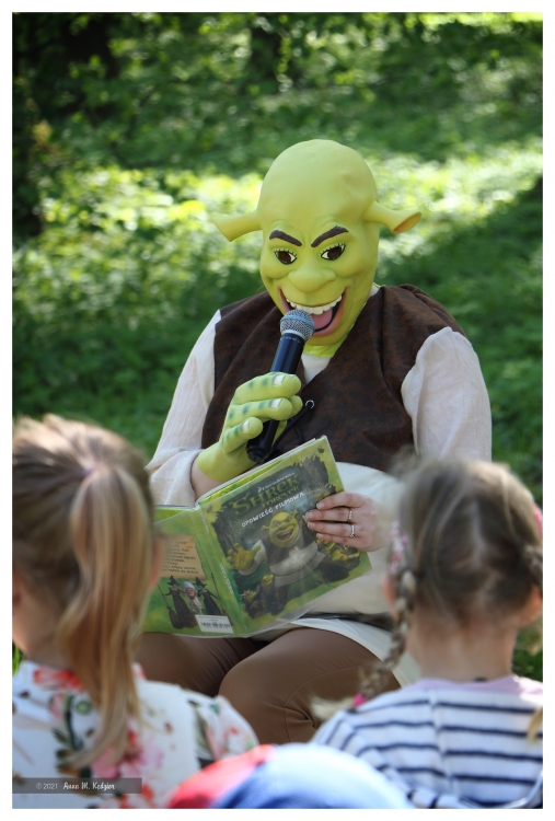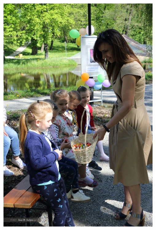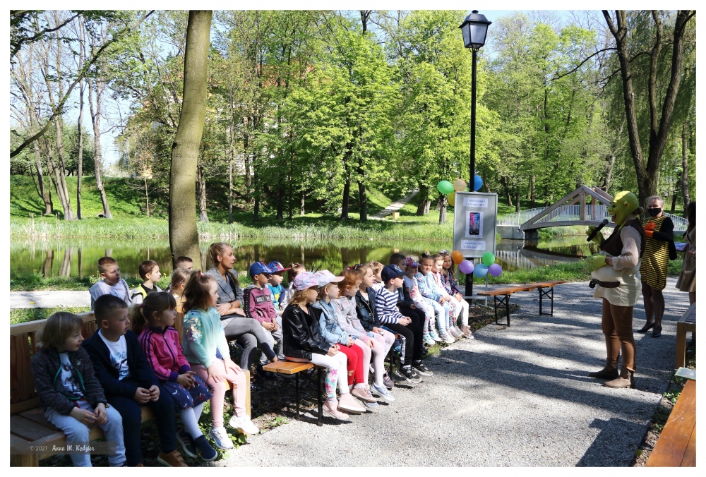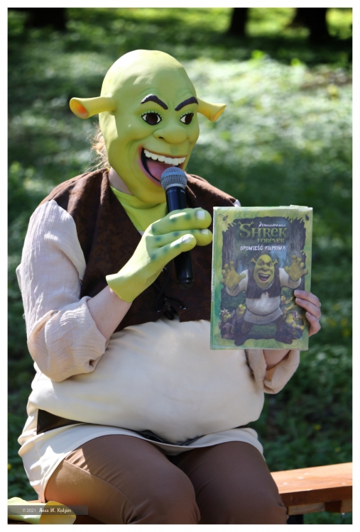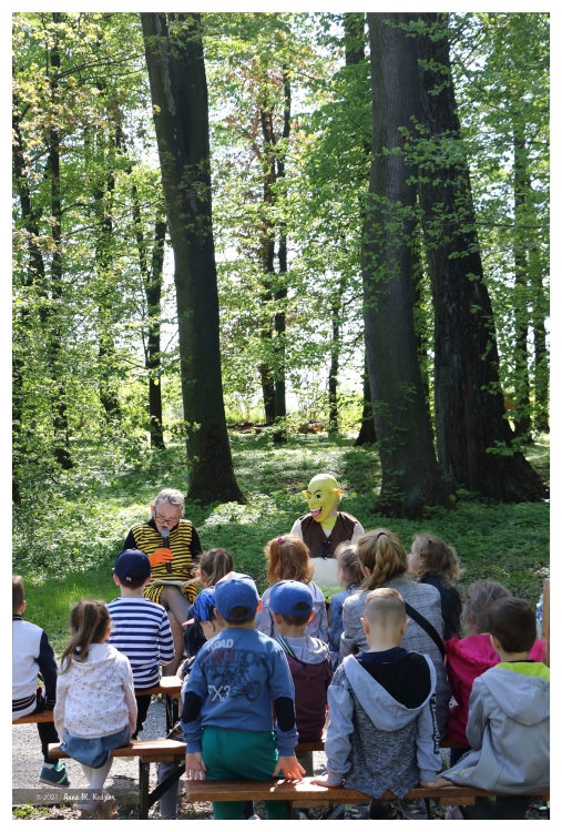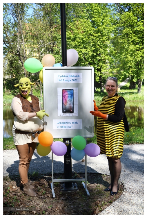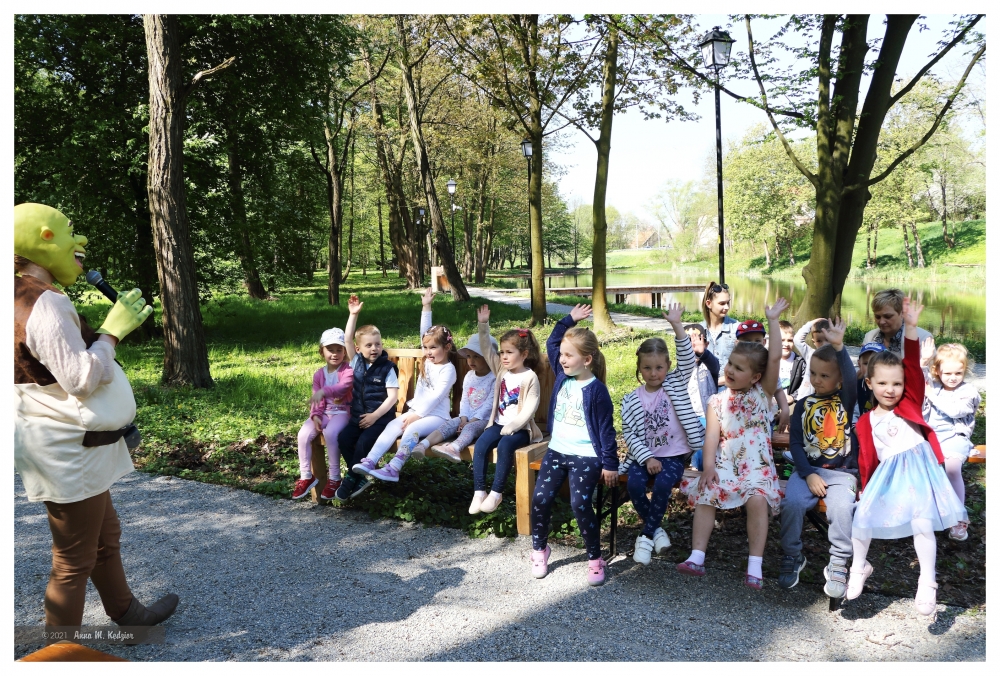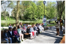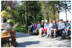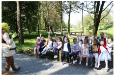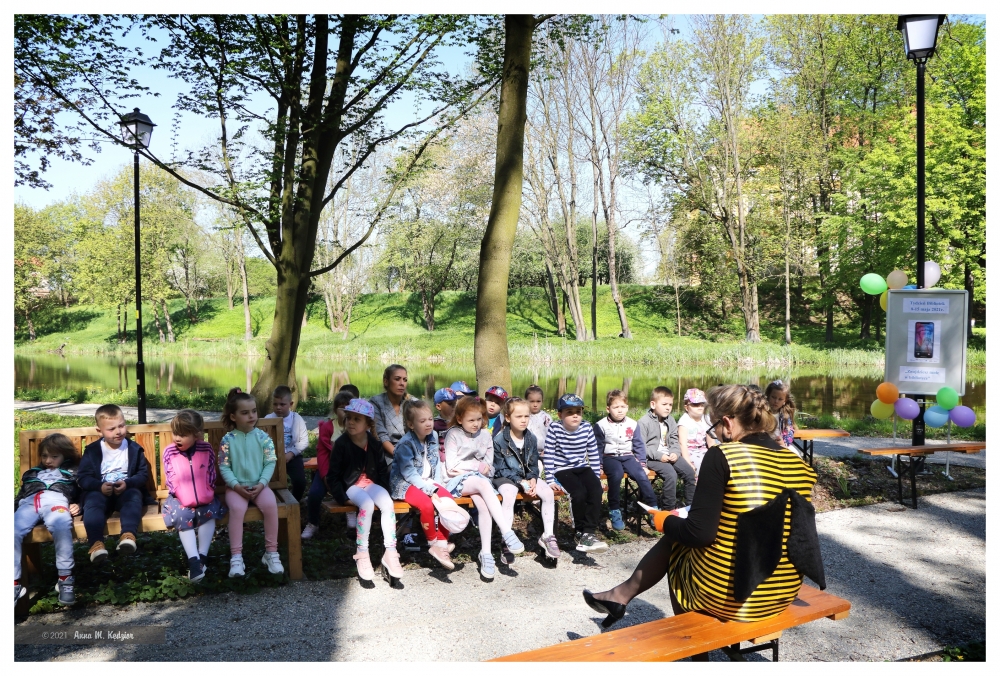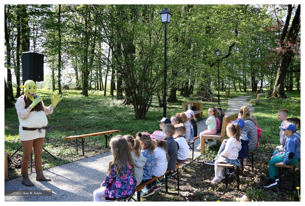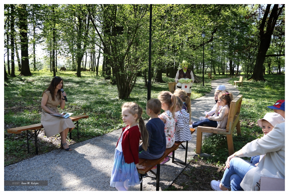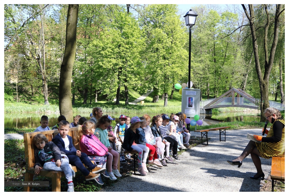 W przepięknej majowej scenerii radłowskiego parku odbyło się urocze spotkanie, podczas którego burmistrz Zbigniew Mączka, dyrektor GCKiC w Radłowie Barbara Marcinkowska oraz bibliotekarki miejskiej książnicy, Barbara Kruk i Katarzyna Baran, czytali dzieciom z okazji trwającego właśnie Tygodnia Bibliotek. Ku lepszej zabawie i większemu zainteresowaniu słuchaczy bibliotekarki wcieliły się w słynne bajkowe postaci: Shreka i pszczółki Mai. Fragment książeczki o przygodach Shreka, krótkie opowiastki o przyjaźni i wiosenne zagadki zachęciły małych słuchaczy do odwiedzania biblioteki, a ekologiczne drewniane zawieszki z naszym logo, które przedszkolaki otrzymały w prezencie, będą przypominały o danej nam obietnicy. Zatem do szybkiego ponownego zobaczenia, miejmy nadzieję, już wkrótce w bibliotece. Dziękujemy dyrekcji radłowskiego przedszkola oraz wychowawcom za możliwość zorganizowania spotkania, a przedszkolakom za miły czas spędzony z książką.