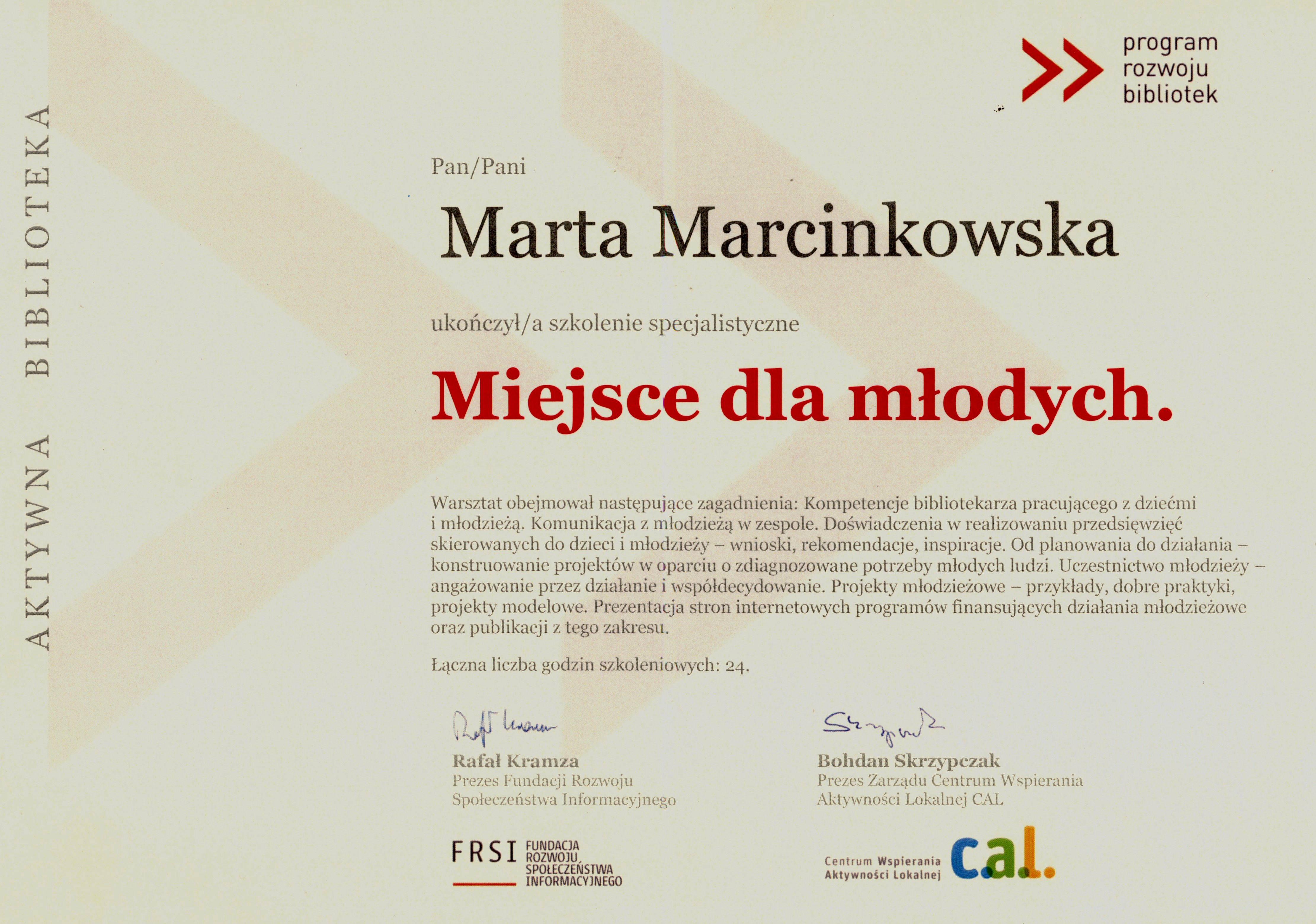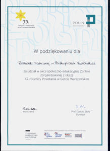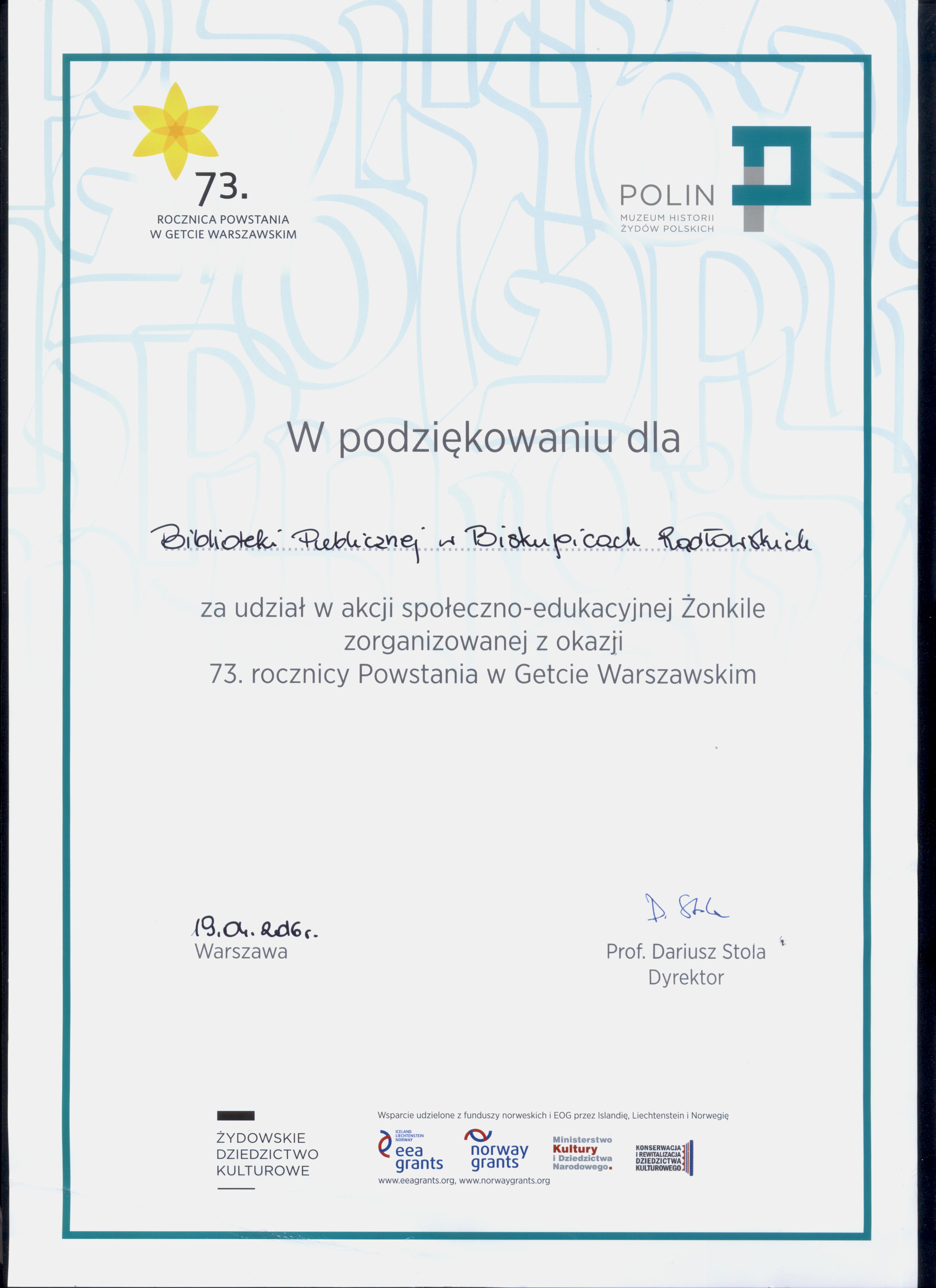 Podziękowanie z Warszawy za udział biblioteki w ogólnopolskim projekcie „Żonkile”, poświęconemu martyrologii Żydów