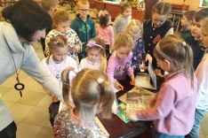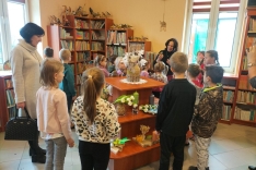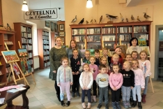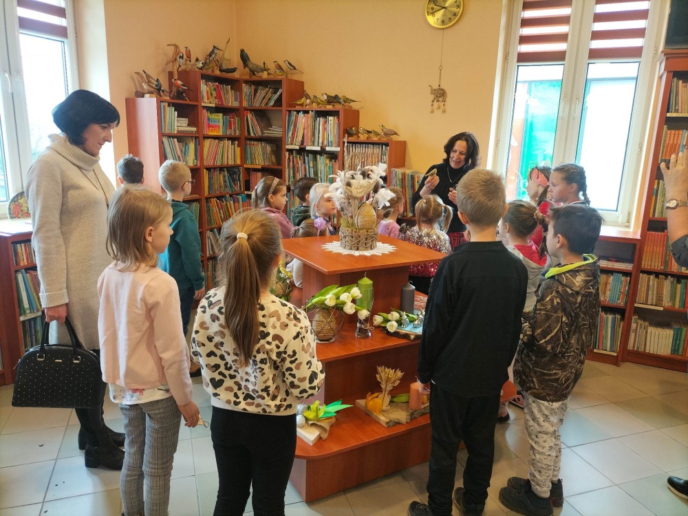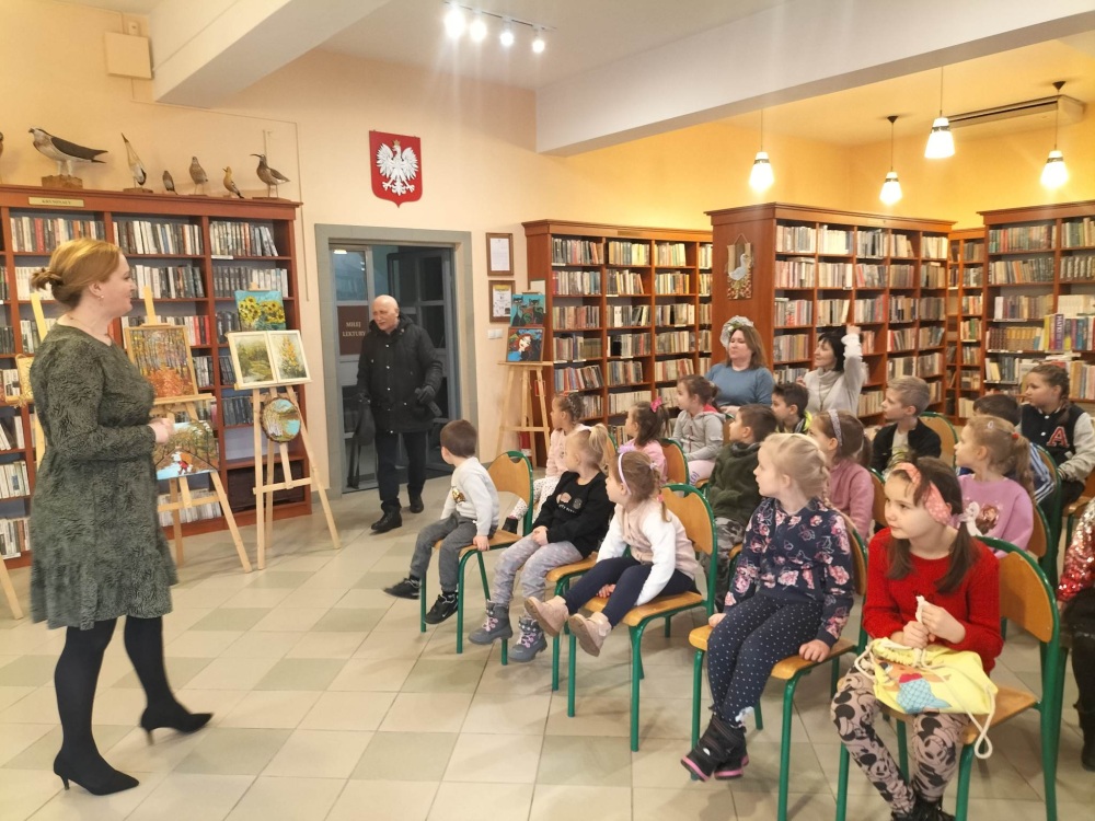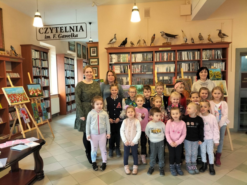 W czasie wizyty dzieci zwiedziły również prezentowaną w bibliotece wystawę malarstwa i wielkanocnych stroików pani Anny Kędzior oraz kolekcję ptaków w drewnie pana Andrzeja Kwapniewskiego.