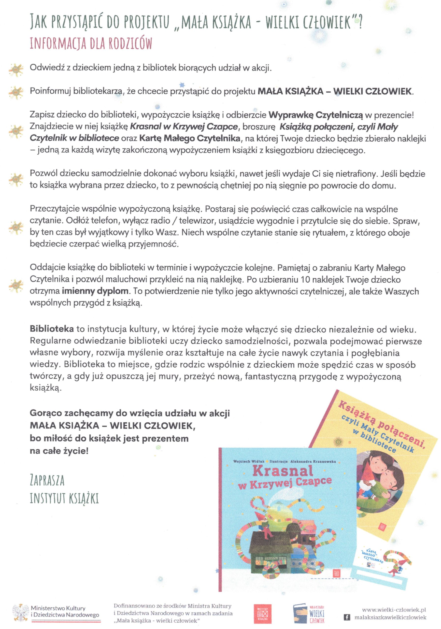 Nasza biblioteka po raz kolejny bierze udział w akcji Instytutu Książki promującej czytelnictwo wśród najmłodszych „Mała książka-wielki człowiek”. Zapraszamy rodziców wraz z dziećmi po odbiór wyprawek czytelniczych.