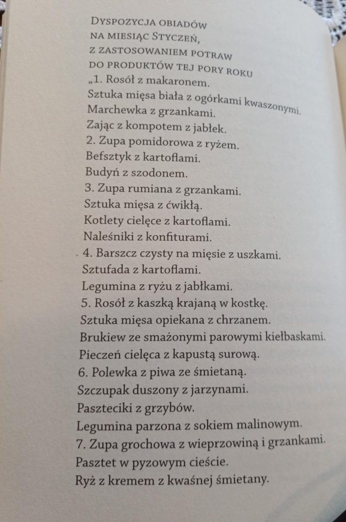 Było bardzo ciekawie i pysznie zarazem, ponieważ przy takiej lekturze nie mogło zabraknąć małego co nieco. Poniżej lista obiadów na miesiąc styczeń polecany przez panią Ćwierczakiewiczową i prezentowany w tej publikacji.
