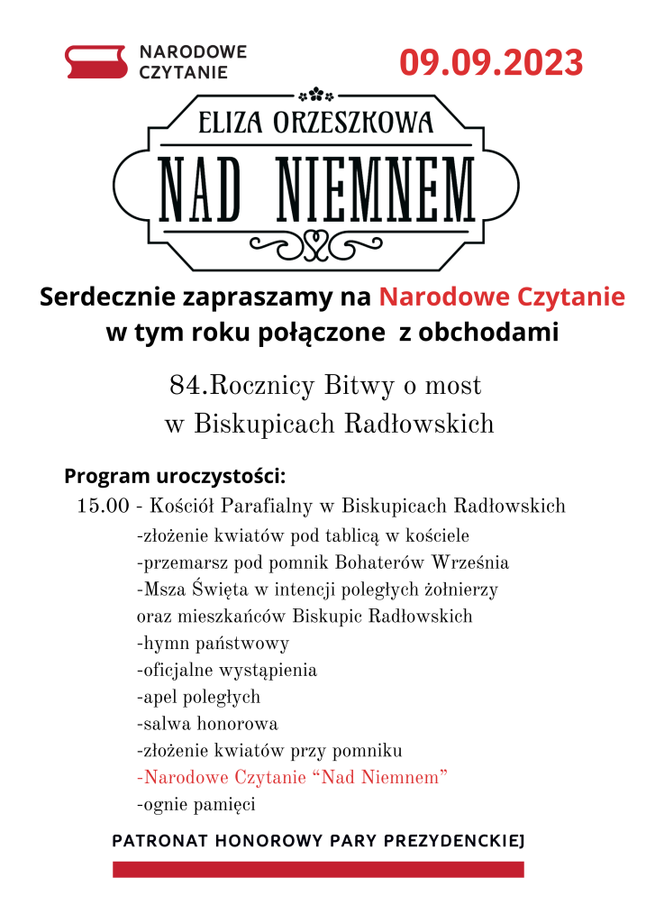 Serdecznie zapraszamy na Narodowe Czytanie „Nad Niemnem” Elizy Orzeszkowej nad malowniczy Dunajec w Biskupicach Radłowskich.