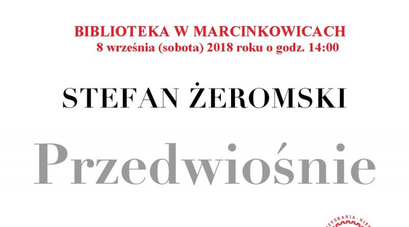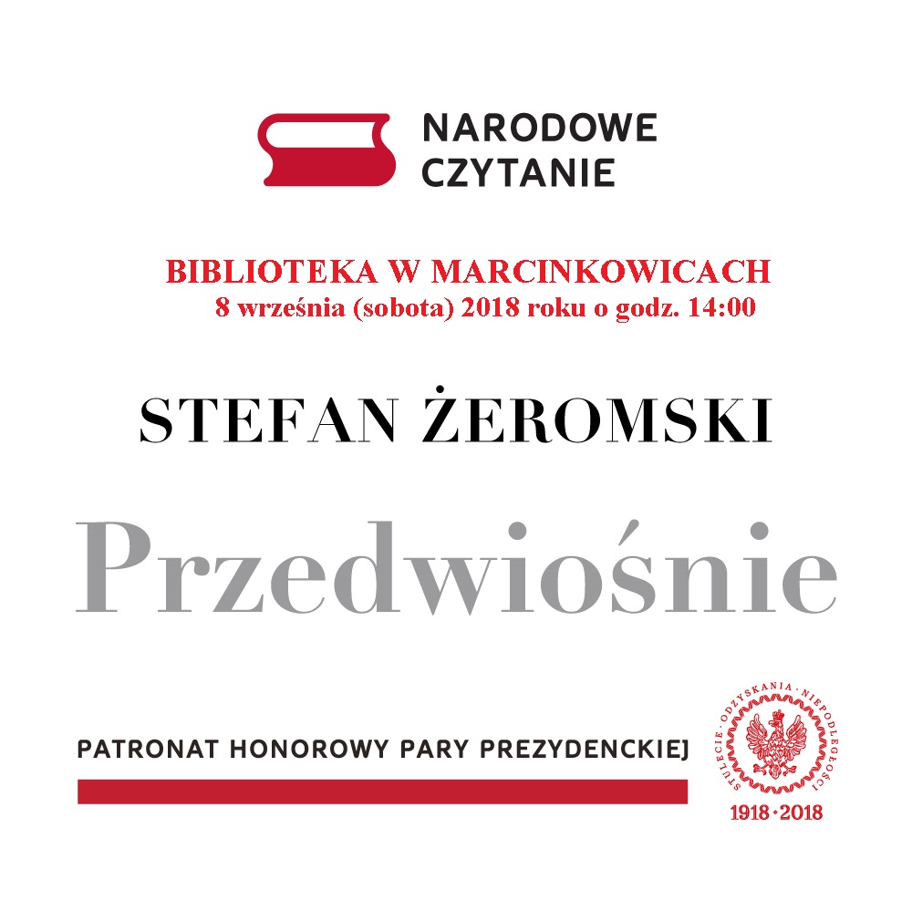 W ramach Narodowego Czytania do wspólnego czytania „Przedwiośnia” zaproszeni zostaną: nauczyciele, ksiądz, sołtys, stali czytelnicy biblioteki i uczniowie. Zwieńczeniem akcji będzie wspólna biesiada na tarasie widokowym biblioteki, podczas której uczestnicy wspominać będą swój pierwszy kontakt z dziełem Żeromskiego. Na czas Narodowego Czytania biblioteka ubrana zostanie w narodowe barwy. Dodatkowo akcji towarzyszyć będzie ekspozycja dzieła Stefana Żeromskiego. Wydarzenie uświetni oprawa muzyczna z epoki twórczości autora przygotowana przez uczennicę gimnazjum. Spotkanie ma formułę otwartą, każdy może w nim wziąć udział. Zapraszamy!