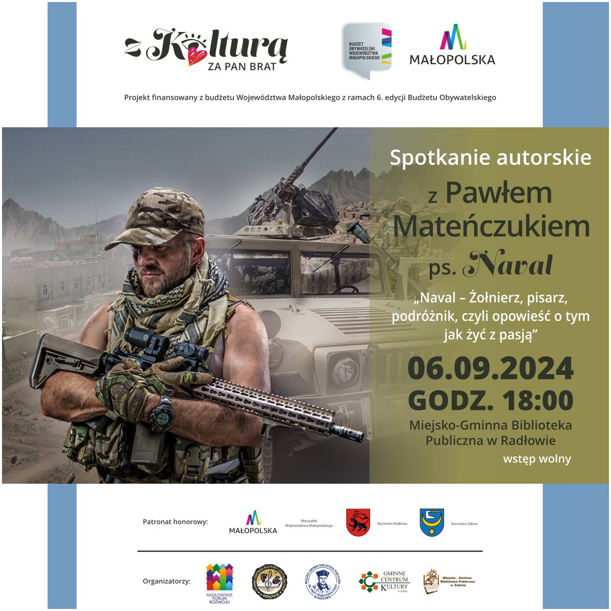 Radłowskie Forum Rozwoju wraz z Miejsko-Gminną Biblioteką Publiczną im. prof. Franciszka Ziejki w Radłowie serdecznie zapraszają na spotkanie autorskie z panem Pawłem Mateńczukiem ps. „Naval”- szczegóły na plakacie.