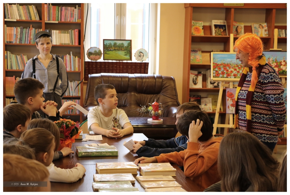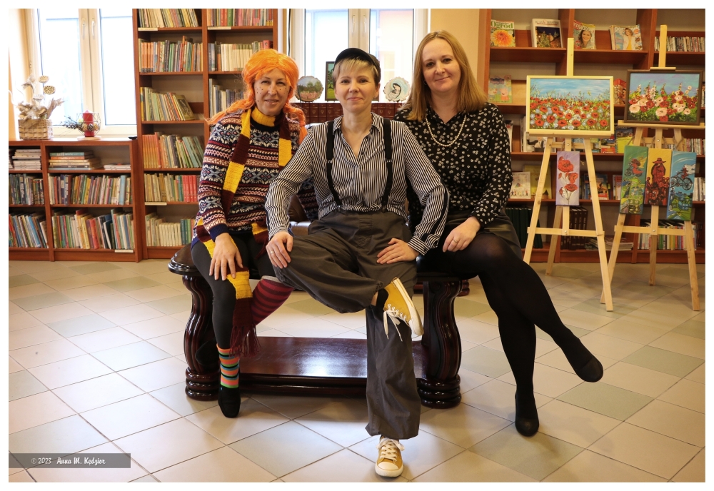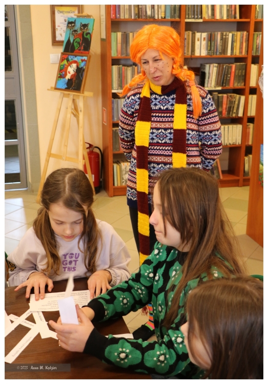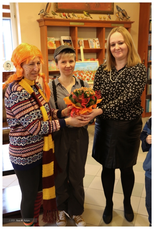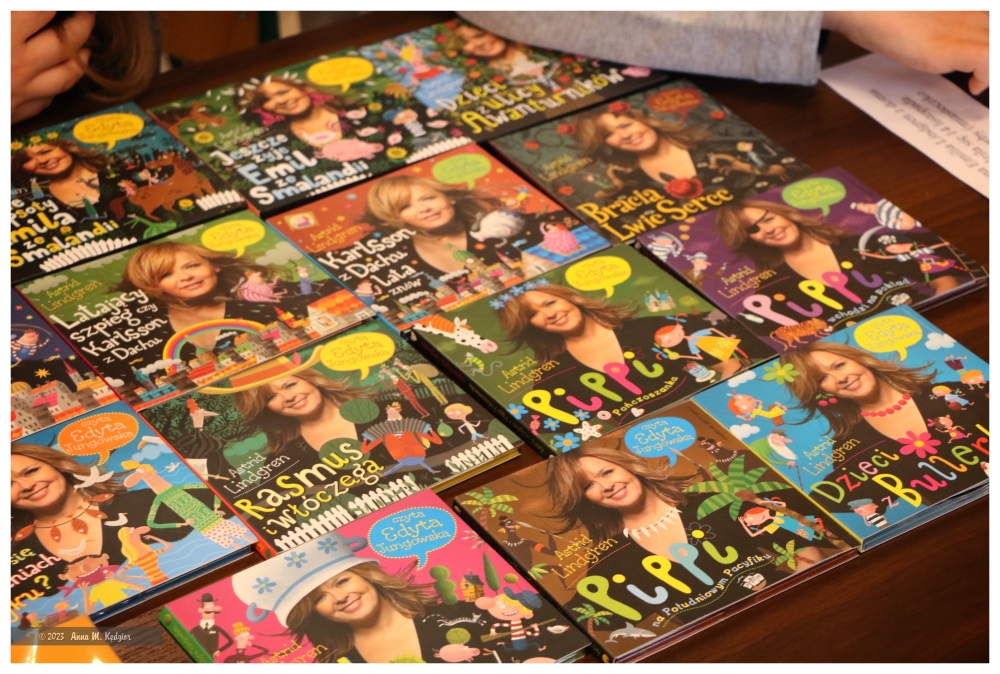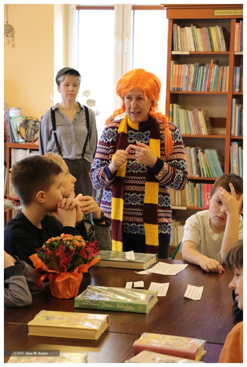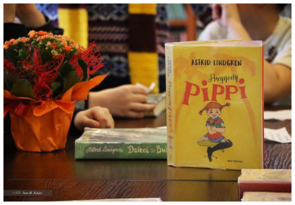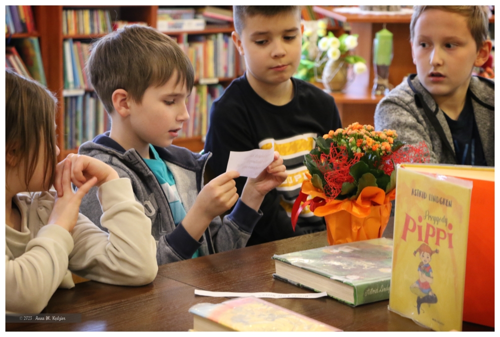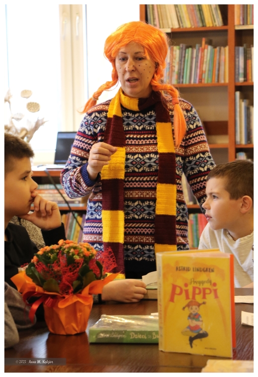 Astrid Lindgren, Pippi Pończoszanka oraz Emil ze Smalandii powitali trzecioklasistów i ich wychowawczynię Panią Danutę Sygnarowicz na lekcji bibliotecznej poświęconej twórczości szwedzkiej pisarki.