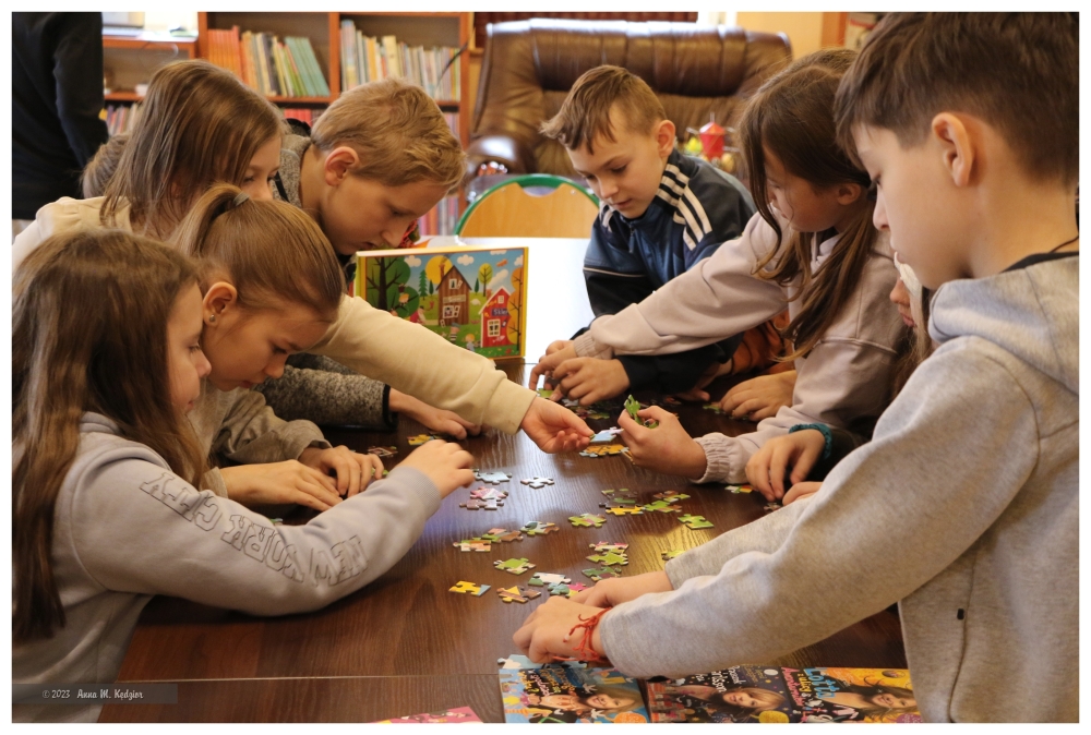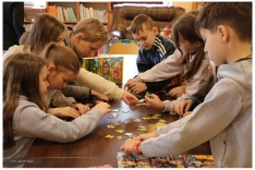 Następnie zapoznały się z innymi książkami Astrid Lindgren dostępnymi w radłowskiej bibliotece oraz audiobookami. Z radością i zaangażowaniem ułożyły kolorowe puzzle przedstawiające widok Bullerbyn. W międzyczasie z zachwytem podziwiały wiosenną wystawę malarstwa i stroików świątecznych Pani Anny Kędzior prezentowaną w naszej bibliotece.