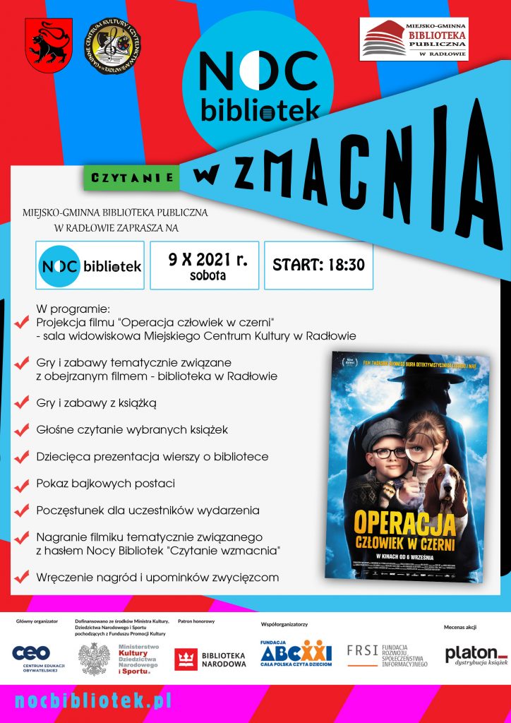 Noc Bibliotek to ogólnopolska akcja przekonująca do czytania poprzez promocję lokalnych bibliotek jako najbliższych miejsc spotkań z kulturą, z różnorodnymi zasobami i bezpłatną ofertą dla społeczności, sprzyjających wymianie idei i integracji. Centrum Edukacji Obywatelskiej akcję zainicjowało i rozwija pod patronatem Biblioteki Narodowej, z udziałem współorganizatorów – Fundacji ABCXXI – Cała Polska czyta dzieciom oraz Fundacji Rozwoju Społeczeństwa Informacyjnego, a także licznych partnerów i patronów.