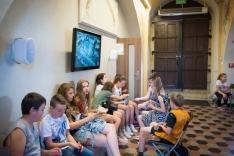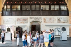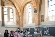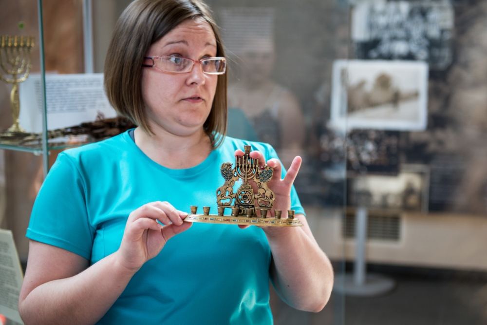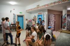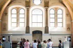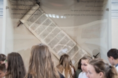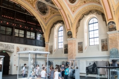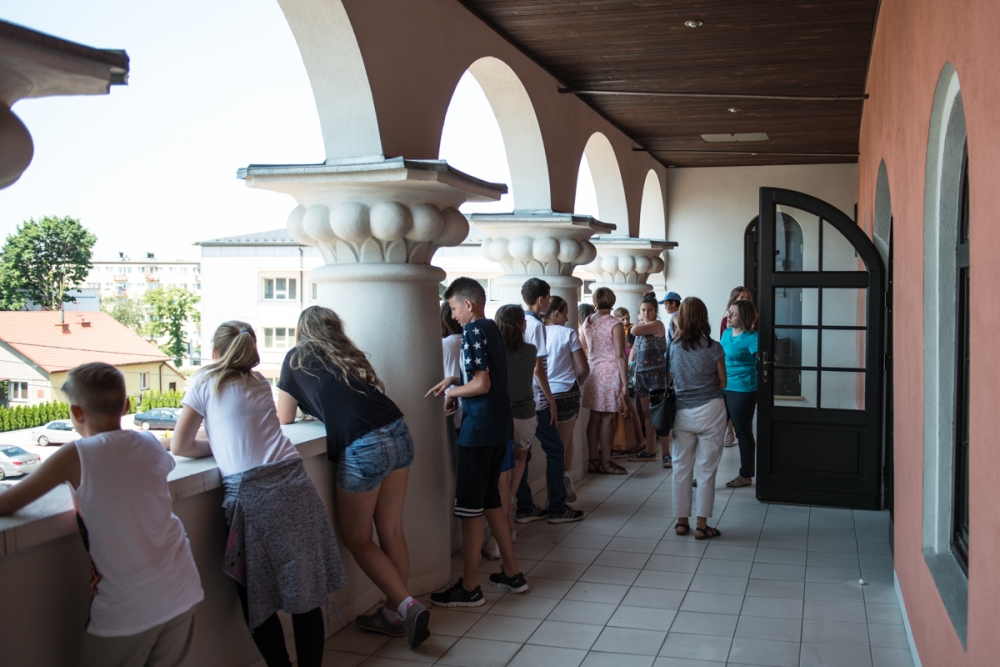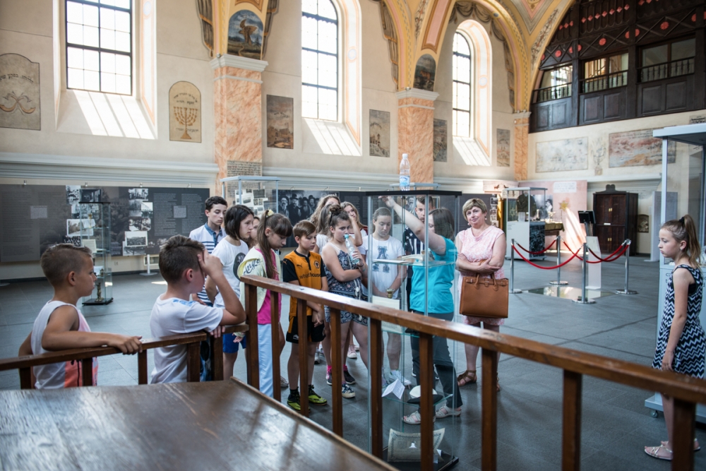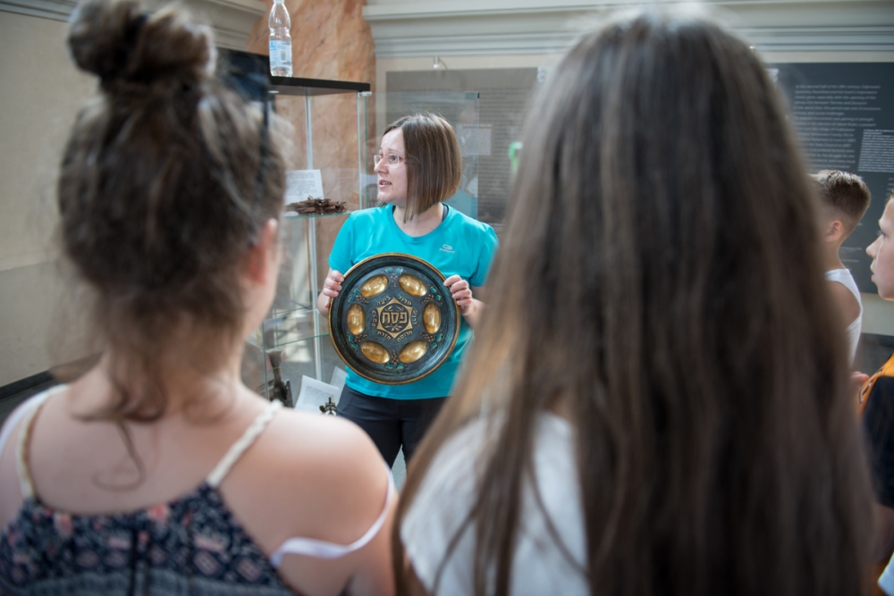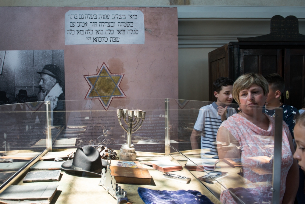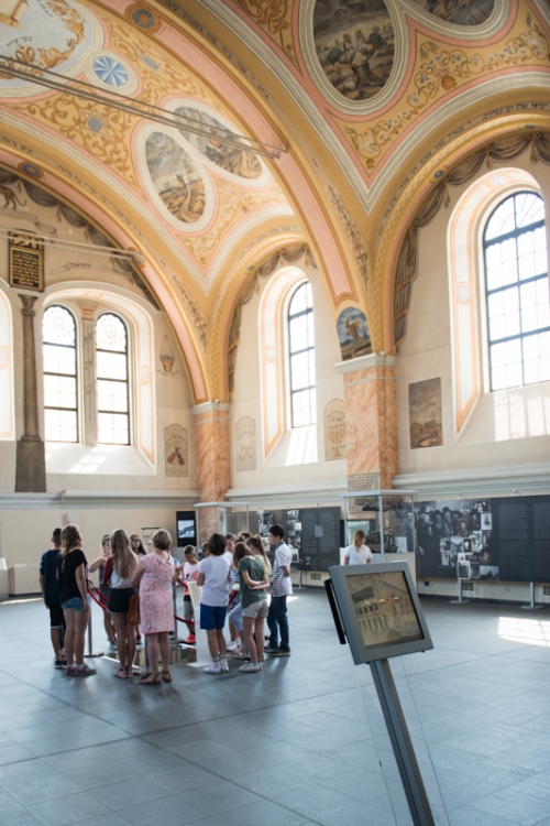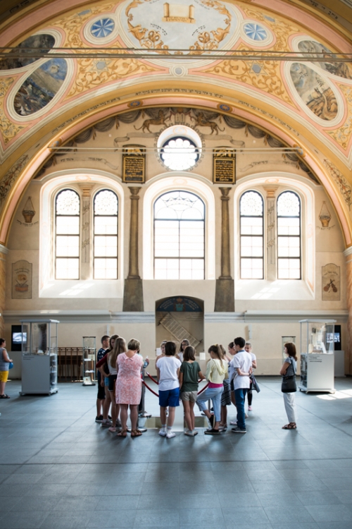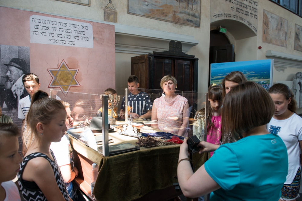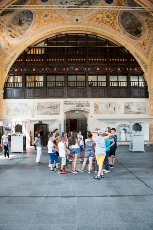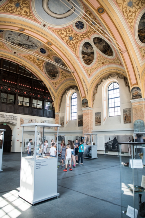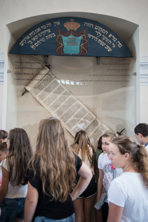 Następnie udaliśmy się do Synagogi gdzie uczniom przybliżono historię społeczności żydowskiej opartą na zgromadzonych eksponatach używanych podczas świąt żydowskich, ubiorach, starych fotografiach książek i odrestaurowanych malowidłach a przede wszystkim zobaczyli największą świętość Żydów – oryginalną Torę.