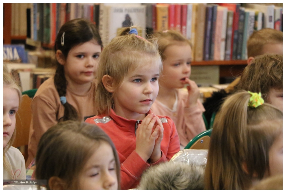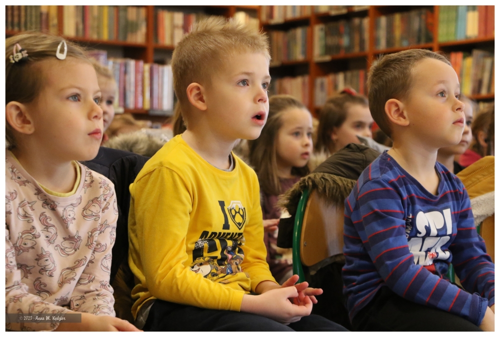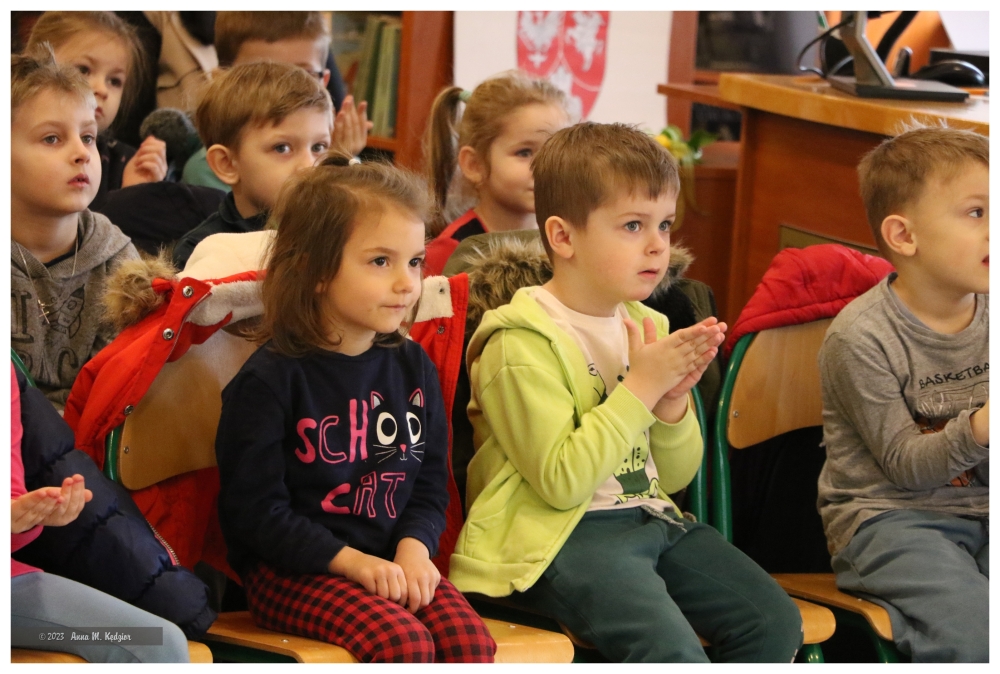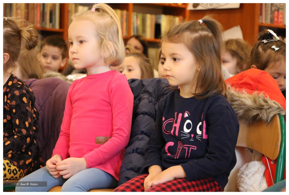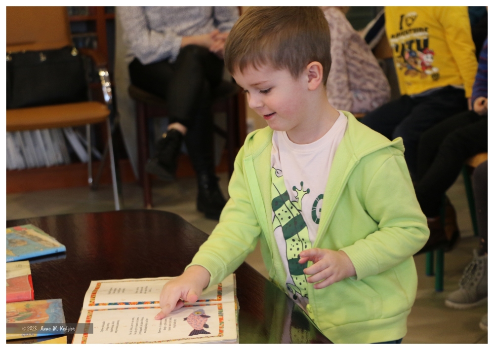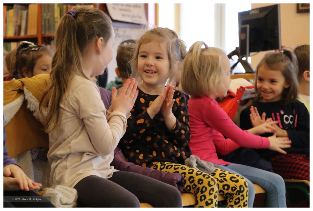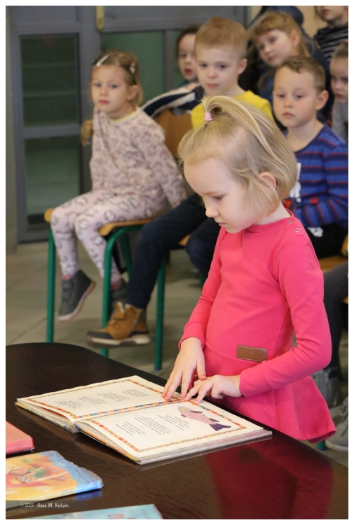 Piosenka „Mądra rzeka” wprowadziła dzieci w świat książek. Dzieci z radością włączyły się w śpiew i zabawę, następnie wysłuchały opowiadania z cyklu przygód „ O wróbelku Elemelku”, z którego dowiedziały się dlaczego Elemelek powinien uczyć się literek oraz krótkiej opowieści „Dzielny przedszkolaczek”.
