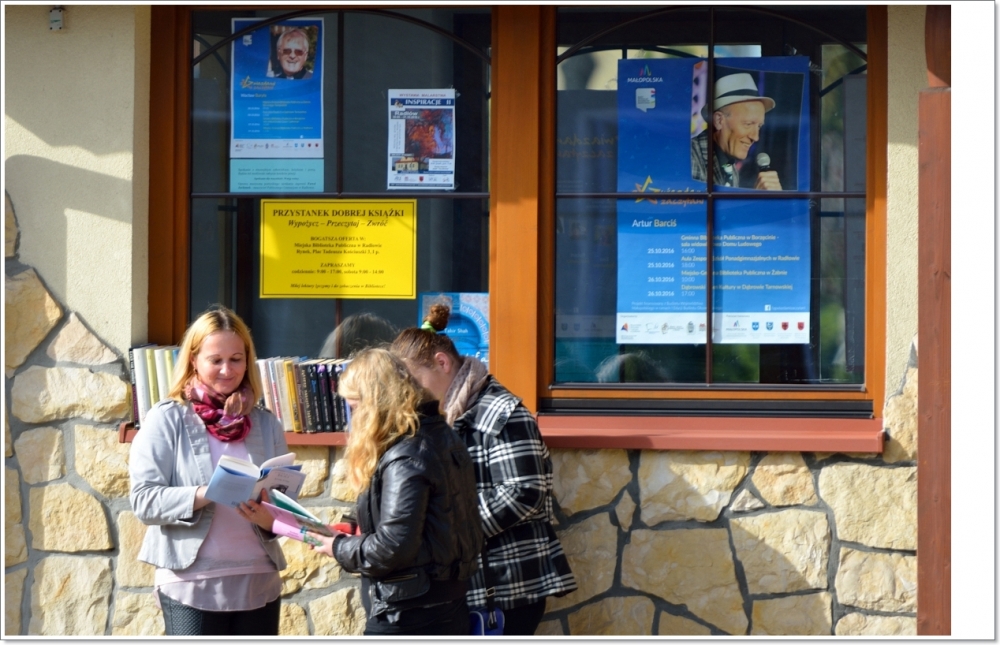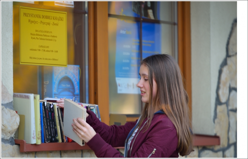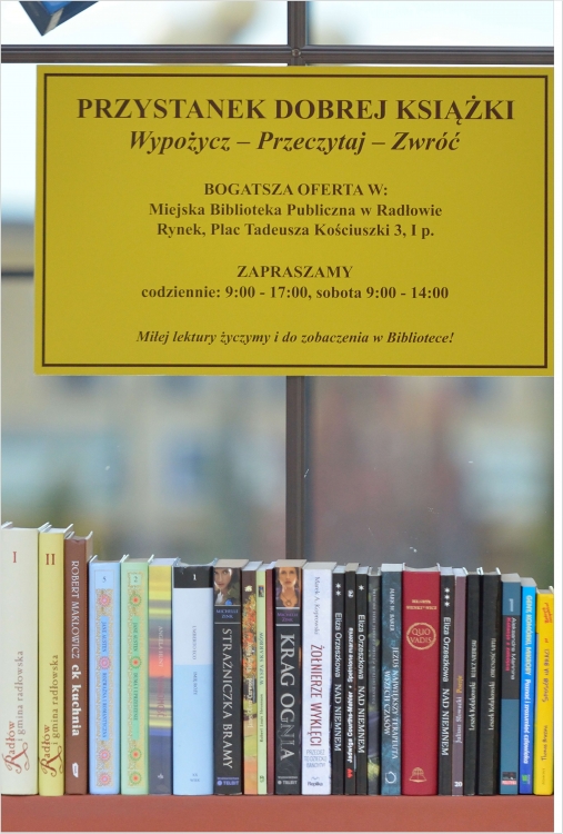 Na miejskim przystanku autobusowym w Radłowie, zwanym „Szanghajem” powstała plenerowa biblioteka, którą nazwano „Przystanek dobrej książki”. Oferta radłowskiej biblioteki jest skierowana do osób podróżujących, w tym szczególnie do młodzieży, oczekujących na autobus. W ofercie czytelniczej znajdują się publikacje nowe jak również używane książki. Podróżujący mogą zabrać książkę na czas podróży i zwrócić ją po powrocie do miasta. Biblioteka plenerowa działa z powodzeniem już kilka miesięcy, pomysł przypadł do gustu nie tylko podróżującym, co nas bardzo cieszy. Należy podkreślić, że korzystający nie tylko systematycznie zwracają książki, ale też wzbogacają bibliotekę nowymi pozycjami ze swoich zbiorów. Dziękujemy mieszkańcom miasta i gminy za poszanowanie zbiorów i troskę o plenerową bibliotekę.