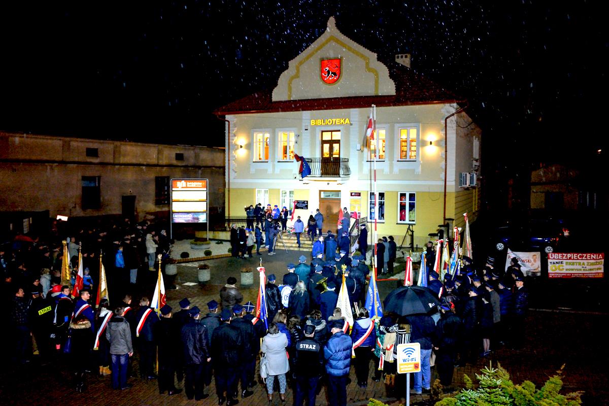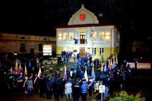 RADŁÓW. Dzień Pamięci „Żołnierzy Wyklętych”. Pierwsza od historycznych wydarzeń, oficjalna uroczystość poświęcona „Żołnierzom Wyklętym” wywodzącym się z ziemi radłowskiej. Na zdj. podniosły moment odsłonięcia pamiątkowej tablicy na radłowskim Ratuszu, poświęconej ludziom, którzy ojczyźnie poświęcili wszystko – niejednokrotnie życie.. 1 marca 2016 r.