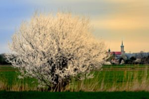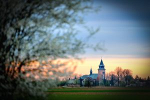RADŁÓW. Kościół radłowski – ujęcie od strony magicznego Zakościele (ogrody zabudowań), kwiecień 2016.