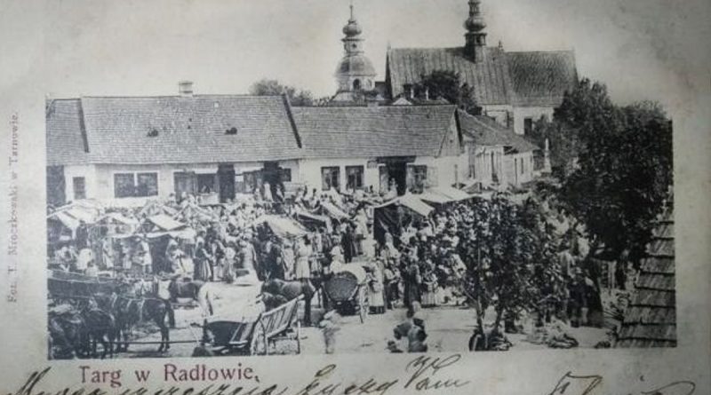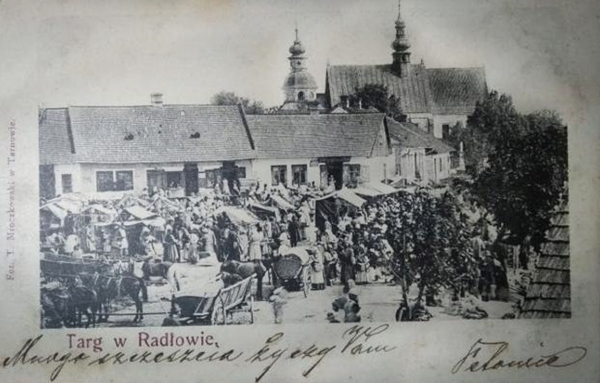 Znów mile zaskoczył nas Ireneusz Banek z Rudki, przekazując do zbiorów biblioteki bardzo ciekawą pocztówkę. Fotografię do niej wykonał znany fotograf Tadeusz Mroczkowski z Tarnowa. Zdjęcie uwieczniło środowe, bardzo popularne w okolicy jarmarki w Radłowie, na które przybywali gospodarze z odległych miejscowości. Pocztówka ukazuje zabudowę rynku, bryłę architektoniczną ówczesnego kościoła, furmanki i jarmarczny gwar. Godne zauważenia jest też kaligraficzne, piękne pismo na odwrociu pocztówki!