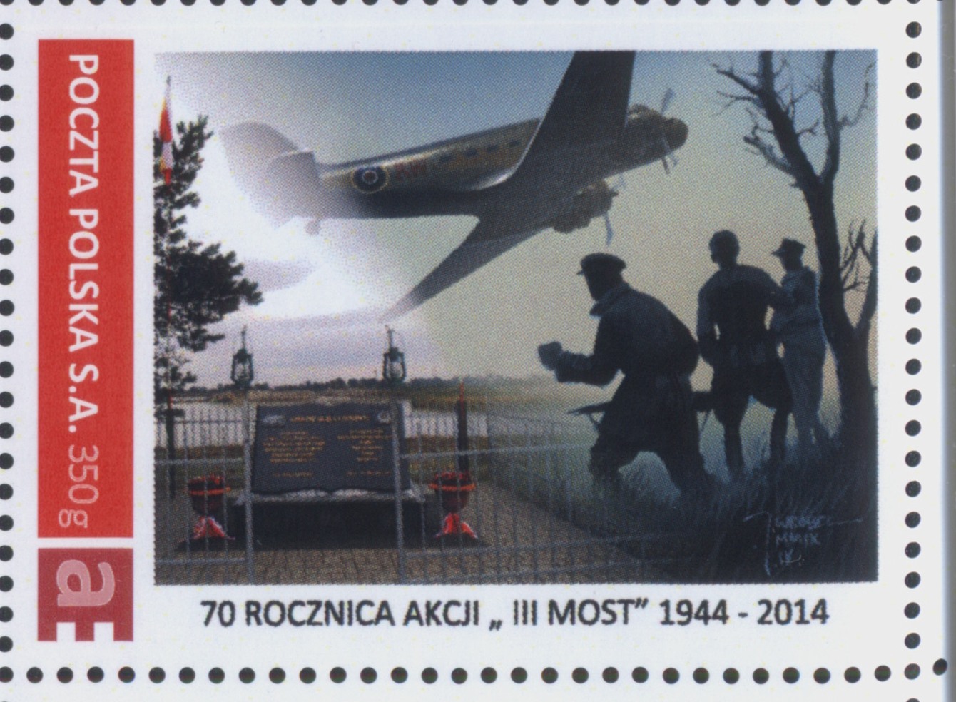 Kolejny znaczek biblioteka wydała z okazji 70. rocznicy brawurowej Akcji III Most w 1944 roku, podczas której żołnierze AK wyekspediowali alianckim samolotem do Anglii fragmenty niemieckiej rakiety V-2. Znaczek przedstawia m.in. byłe polowe lądowisko „Motyl” w Wał-Rudzie, skąd startowała brytyjska Dakota, (2014).
