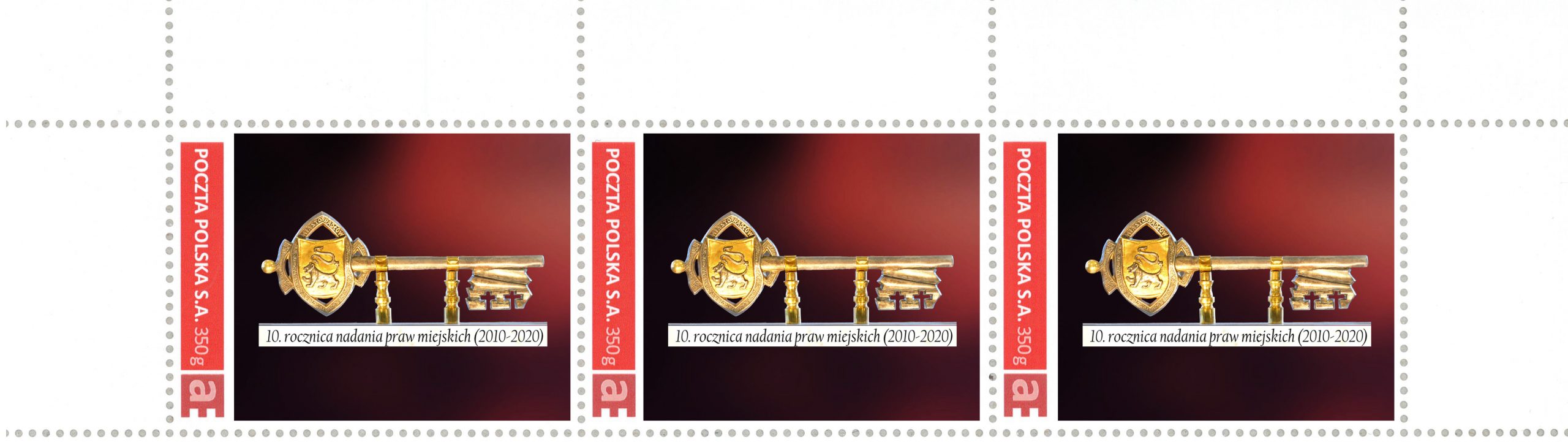 Znaczek na okoliczność 10. rocznicy nadania praw miejskich Radłowowi. Na znaczku zamieszczono klucz do bram miasta projektu prof. Czesława Dźwigaja, (2020).