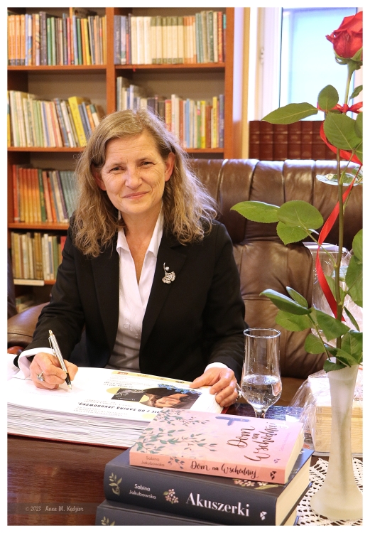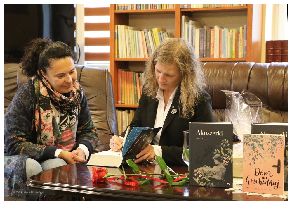 Fascynujące jest życie, fascynujące są bohaterki powieści Pani Sabiny i fascynująca jest sama autorka. Osoba wielu zawodów, talentów i umiejętności, ujmująca, serdeczna, skromna. Znawczyni i miłośniczka lokalnej historii, ziemi swoich przodków. Właśnie tam- w Jadownikach, koło Brzeska osadziła akcję swojej książki, która rozpoczyna się w 1885 roku i toczy nieprzerwanie aż po lata 50 XX wieku. Jak powiedziała sama autorka „Chcę przypomnieć ciche bohaterki żyjące pod każdą szerokością geograficzną, które nieprzerwanie od tysiącleci pomagały kobietom w porodzie, przyjmowały życie bez względu na warunki, status społeczny, wyznanie- akuszerki”. Pani Sabina jest prawnuczką akuszerki- Anny Czerneckiej, która zagościła na kartach powieści. Czy jest ona główną bohaterką, czy też nie czytelnicy będą mogli się przekonać sięgając po powieść, już dostępną w naszej bibliotece.