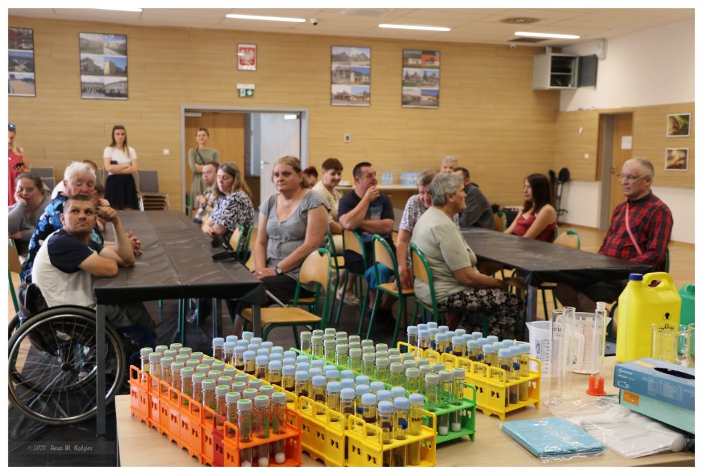 „Dyfuzja pod kontrolą, czyli naukowe farbowanie koszulek”- pod taką nazwą 4 lipca w radłowskim MCK odbyło się spotkanie z naukowcami z Laboratorium Pana Korka: Agnieszką Jaworską i Michałem Szydłowskim. Pani Agnieszka wraz z panem Michałem najpierw zabezpieczyli parkiet i stoły czarną folią (gdyby ktoś wtedy przyszedł do MCK mógłby odnieść wrażenie, że szykują salę tortur). Następnie wnieśli mnóstwo pojemników i fiolek, substancje potrzebne w przygotowaniu roztworów, odczynniki i piękne, żółte „mieszadło wirnikowe”- przez starsze pokolenie nazywane „Franią”. A wszystko po to, by przeprowadzić kolorowy, naukowy zawrót głowy. Uczestnicy dowiedzieli się, że dyfuzja to proces swobodnego rozprzestrzeniania się cząsteczek w danym ośrodku (gazie, cieczy, czy ciele stałym). Wykorzystali tę wiedzę do ufarbowania otrzymanych, bawełnianych koszulek. Pan Michał wyjaśnił, iż włókna bawełny w koszulkach odpowiednio nawilżone, zanurzone w roztworze sody, potraktowane humektantem, którego rolę pełnił syntetyczny mocznik będą wspaniale przyjmować podane barwniki- a więc dojdzie do dyfuzji właśnie.