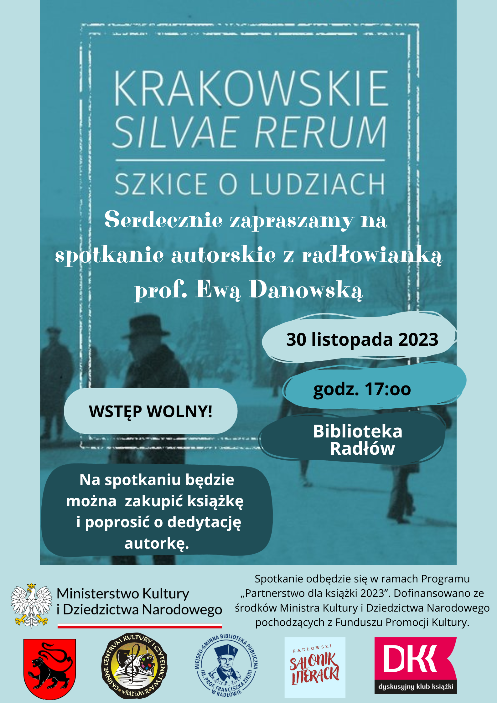 Serdecznie zapraszamy do radłowskiej biblioteki 30 listopada na godz. 17.00, na spotkanie z radłowianką prof. Ewą Danowską- autorką książki „Krakowskie silvae rerum. Szkice o ludziach”. Spotkanie poprowadzi pan Józef Trytek, autor licznych publikacji dotyczących historii Radłowa. Na spotkaniu będzie można zakupić prezentowaną książkę z dedykacją pani profesor.