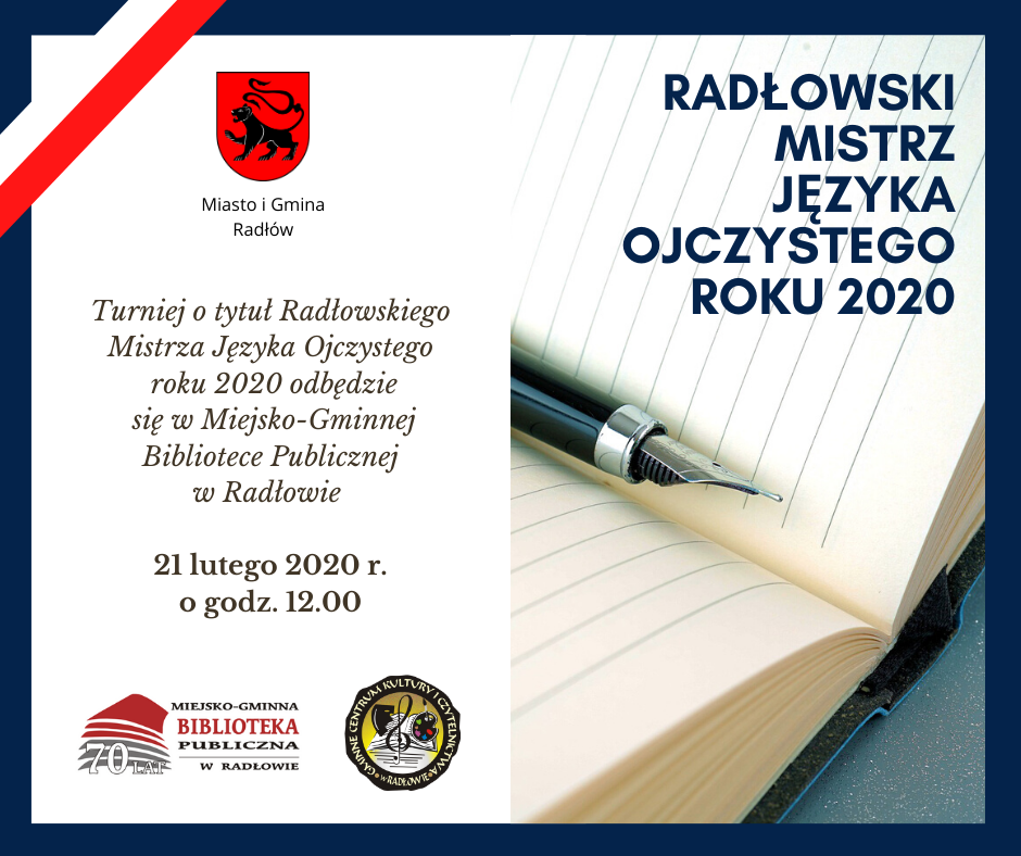 W piątek 21 lutego w Międzynarodowym Dniu Języka Ojczystego młodzież kl. 7-8 ze Szkoły Podstawowej w Radłowie weźmie udział w Turnieju o tytuł Radłowskiego Mistrza Języka Ojczystego roku 2020. Turniej odbędzie się w Miejsko-Gminnej Bibliotece Publicznej w Radłowie o godz. 12.00. Pytania będą dotyczyć ogólnej znajomości języka polskiego (ortografia, gramatyka, literatura, nauka o języku).