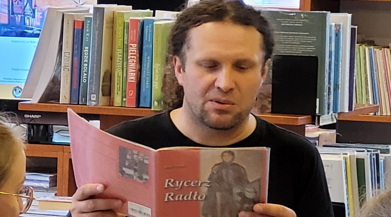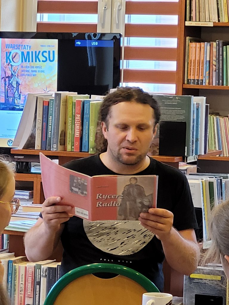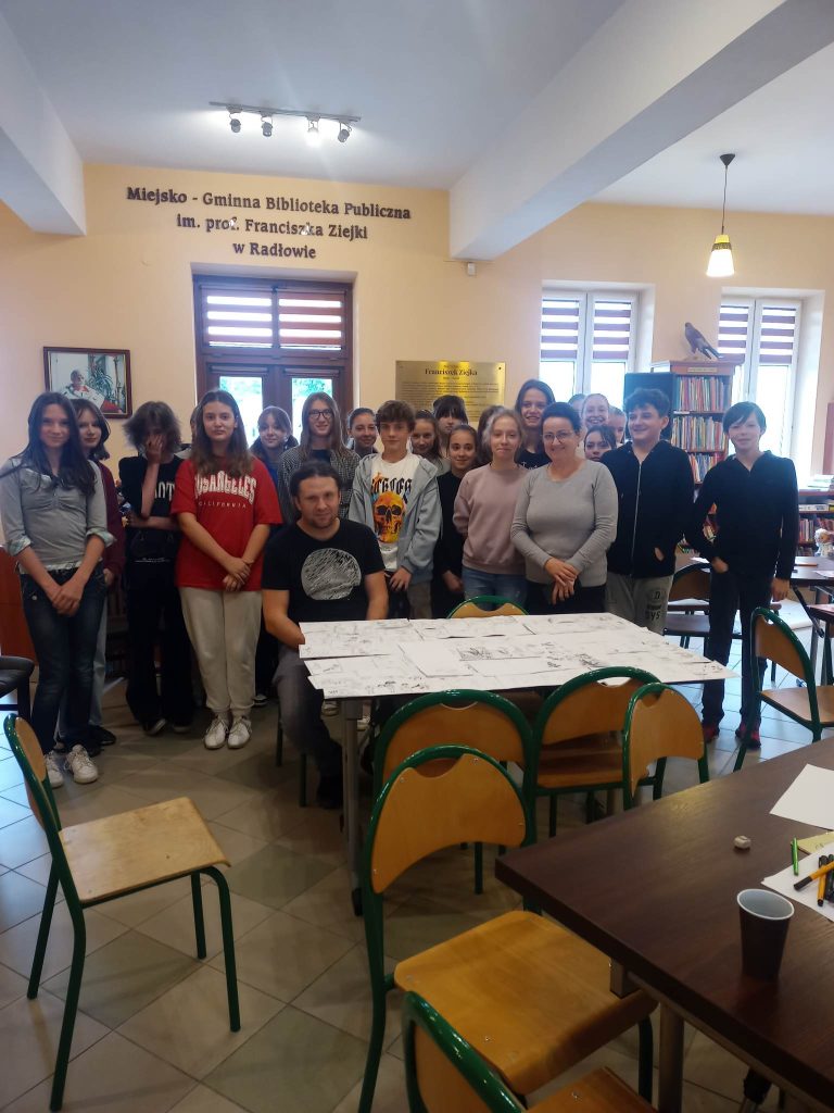 Uczniowie ze Szkoły Podstawowej w Radłowie mieli okazję 7 czerwca zapoznać się ze sztuką tworzenia komiksu na warsztatach prowadzonych pod okiem znanego rysownika, malarza, karykaturzysty- Szymona Teluka, który przyjechał aż z Zielonej Góry. Pan Szymon specjalizuje się w komiksie, ilustracji i karykaturze, współtworzy projekty teatralne, filmowe, reklamowe oraz projektuje gry komputerowe. Wśród zróżnicowanej działalności, którą się zajmuje ważne miejsce stanowi praca dydaktyczna z dziećmi i młodzieżą prowadzona właśnie w formie warsztatów. Uczestnicy radłowskich zajęć zapoznali się pokrótce z historią komiksu, dowiedzieli się jak rysować „dymki” w zależności od rodzaju wypowiedzi bohatera lub jego emocji, jak tworzyć postaci komiksowe i gdzie je wrysowywać oraz jak ważną rolę w komiksie odgrywa ramka poszczególnego obrazka. Na koniec uczniowie wysłuchali tekstu „Rycerz Radło, czyli historia herbu miasta Radłowa”, na podstawie którego sami stworzyli krótkie- 3 lub 4 obrazkowe historyjki komiksowe o rycerzu Radło.