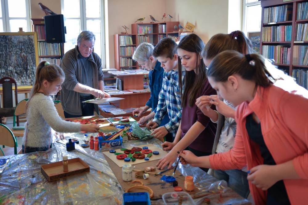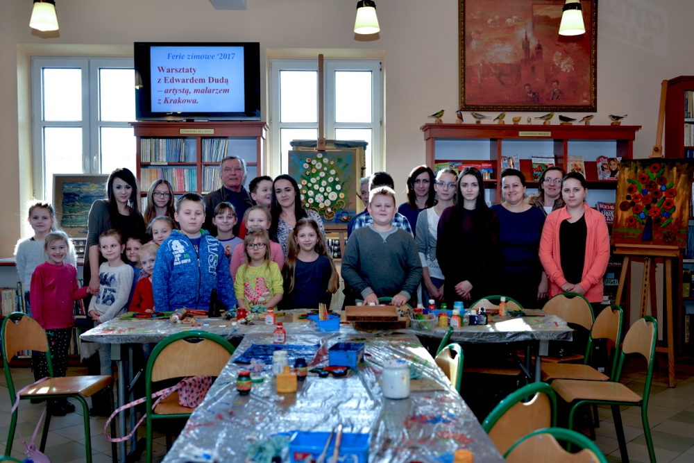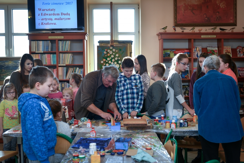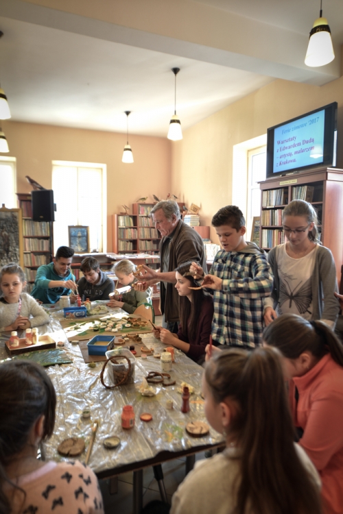 Twórcze warsztaty plastyczne dla dzieci i młodzieży poprowadzone przez krakowskiego artystę Edwarda Dudę. Gość pierwszego dnia ferii w sposób pedagogiczny zaabsorbował swoją pasją twórczą młodych uczestnik warsztatów. W praktyczny sposób ukazał możliwości tworzenia pięknych rzeczy, przy minimalnym udziale kosztów.