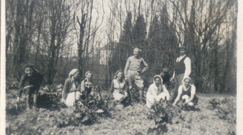 Na innej fotografii podobna grupa pozuje do fotografii. Schludnie odziane w biel ogrodniczki z motyczkami w dłoniach w towarzystwie pana Swierkota, stojąc pewnie na jednej z parkowych ścieżek, z uśmiechem patrzą w obiektyw aparatu.