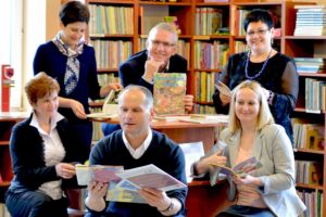 O lewej stoją: dyr. Marta Warias z M-GBP w Żabnie, burmistrz Radłowa Zbigniew Mączka, dyr. MBP w Dąbrowie Tarnowskiej Jadwiga Kusior, kier. GBP w Borzęcinie Elżbieta Kwaśniak, Zbigniew Marcinkowski i kustosz radłowskiej biblioteki Kasia Baran.