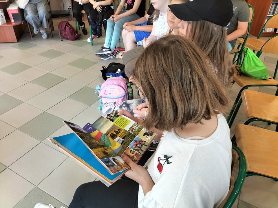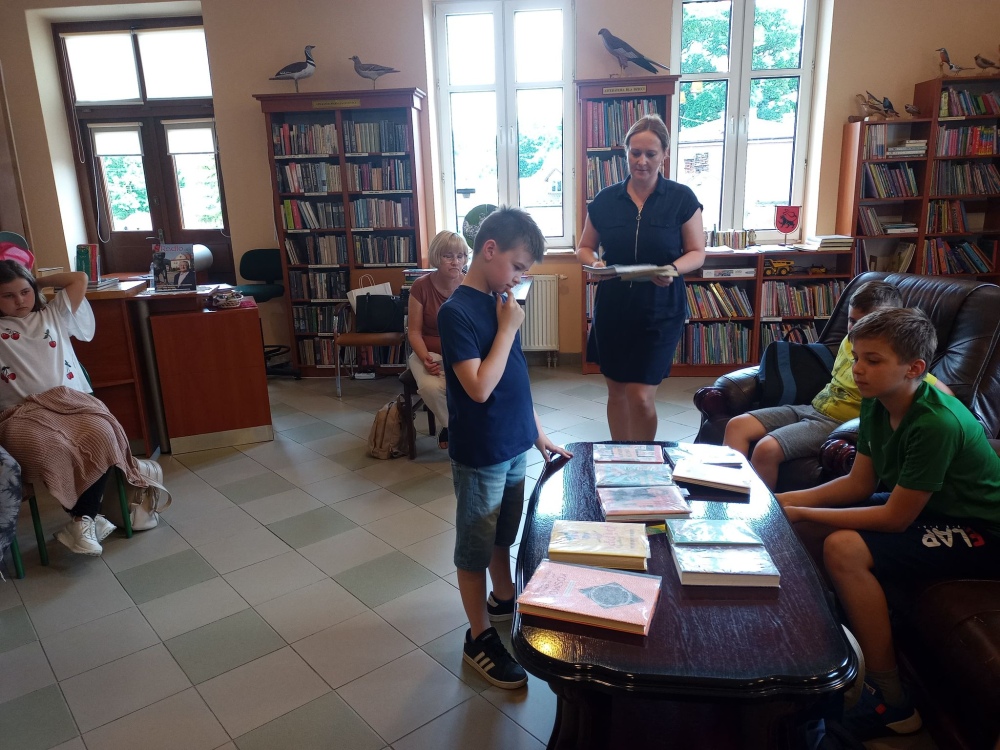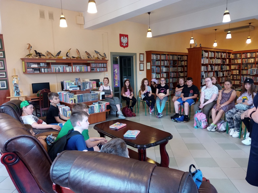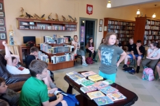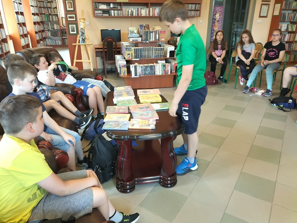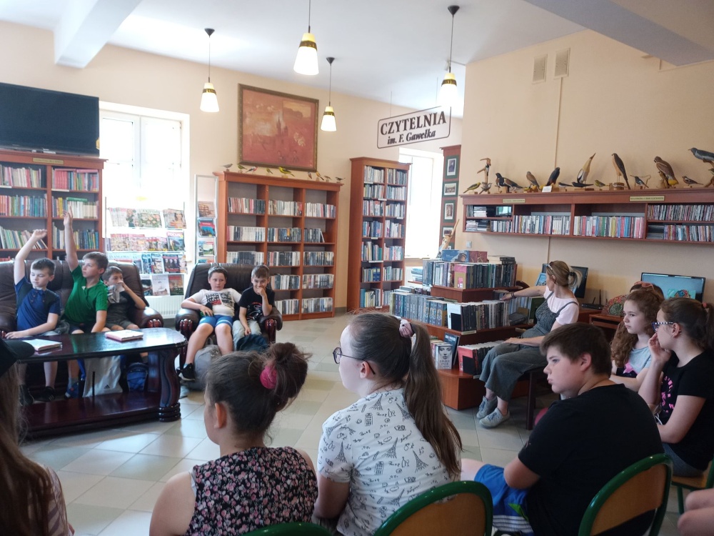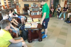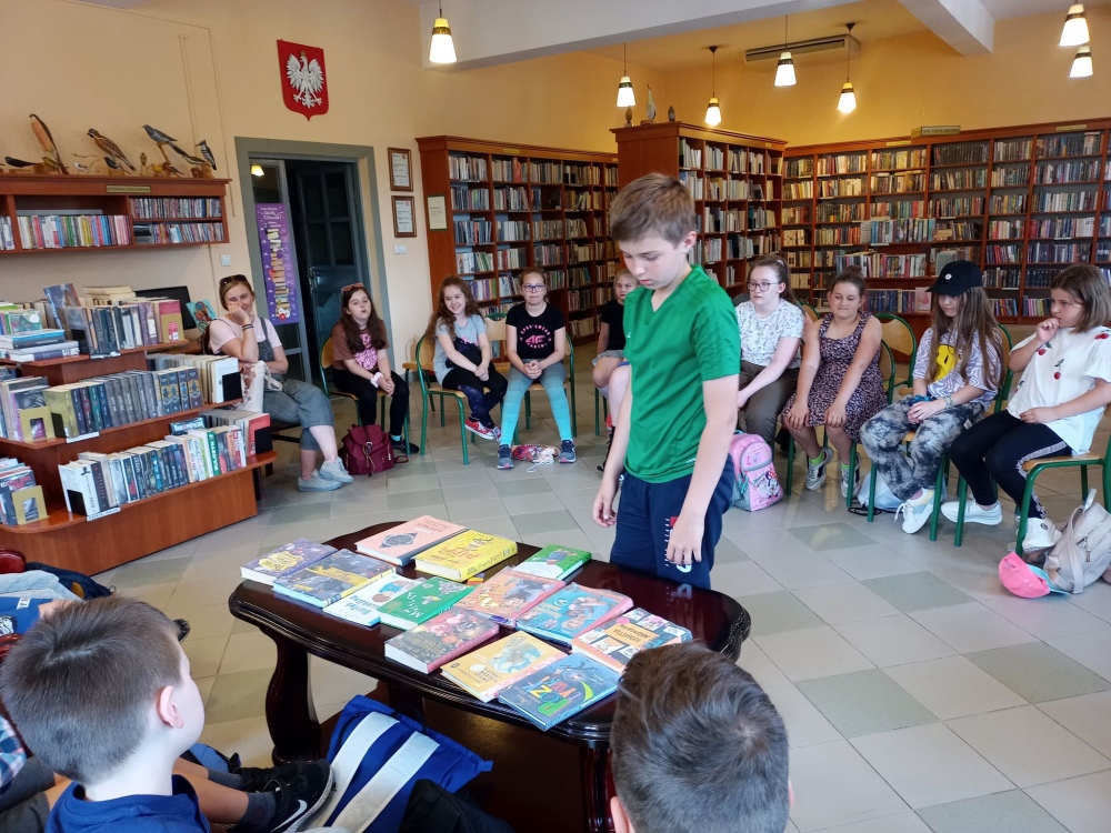 Czas spędzony wśród książek pozwolił na zapoznanie się z wnętrzem naszej książnicy, jej zasobami, jak również z książką Martyny Wojciechowskiej pt. „Zwierzaki świata”.
