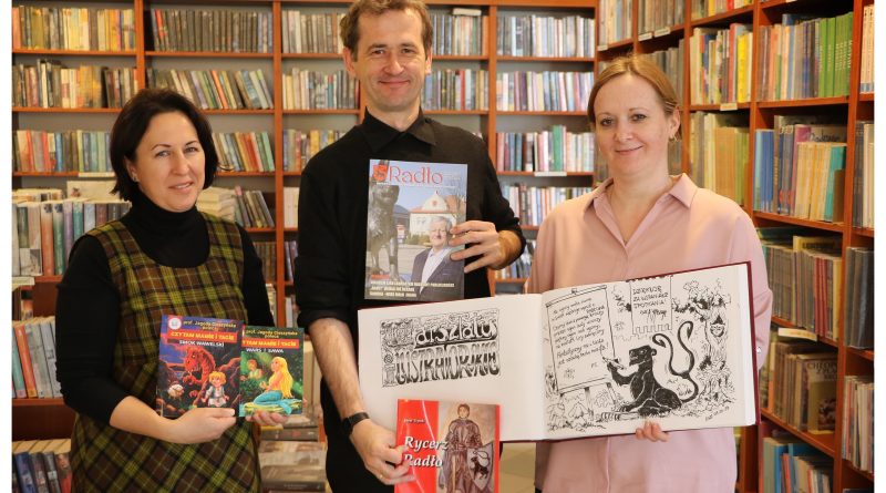 Dzięki uprzejmości pana Józefa Trytka, przekazałyśmy panu Łukaszowi książeczkę pt. „Rycerz Radło czyli historia herbu miasta Radłowa” wraz autografem autora. Wstęp do niej napisała polska autorka książek dla dzieci Ewa Stadtmüller z którą pan Łukasz współpracuje.
